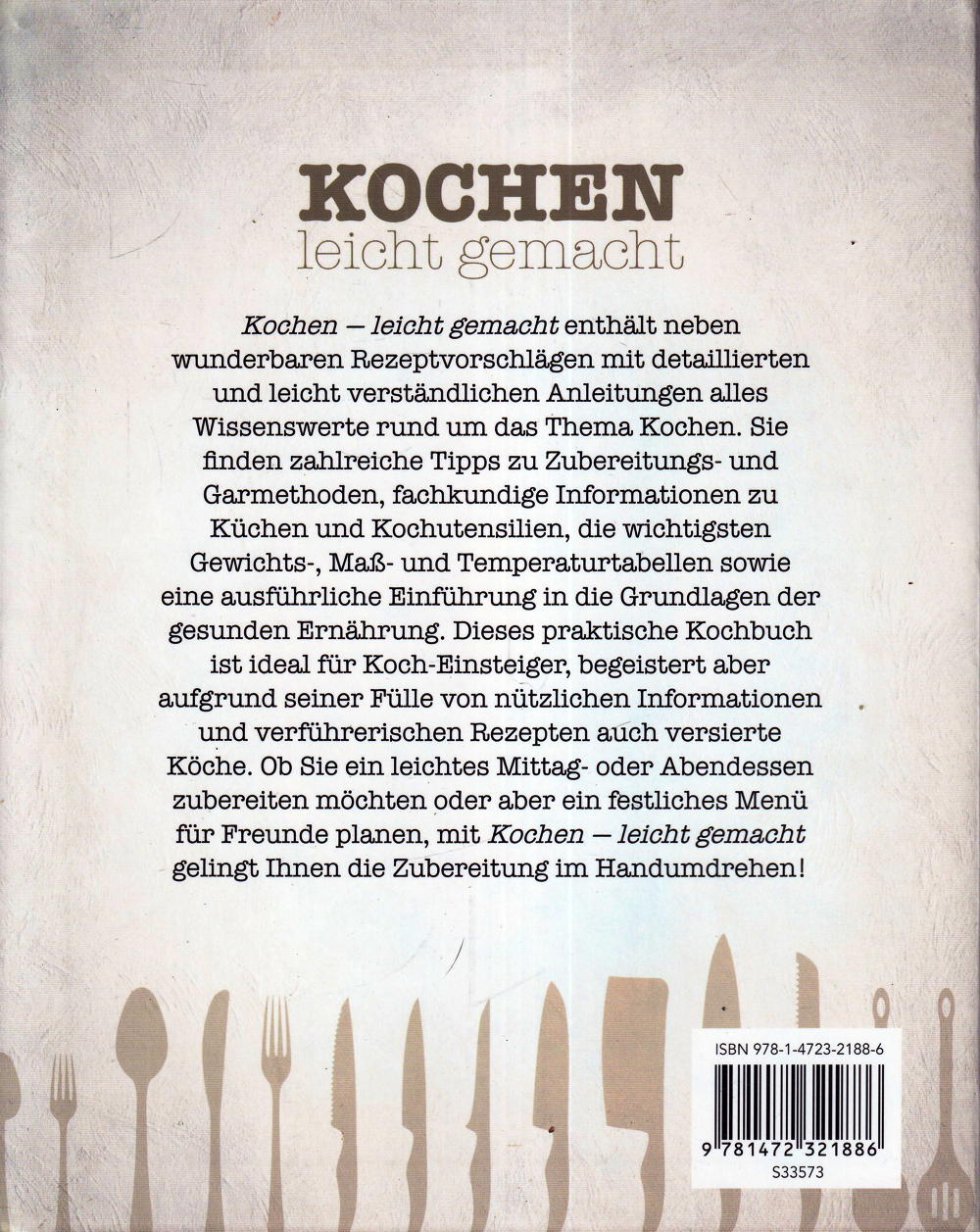 Kochen - leicht gemacht enthält neben wunderbaren Rezeptvorschlägen mit detaillierten und leicht verständlichen Anleitungen alles Wissenswerte rund um das Thema Kochen. Sie finden zahlreiche Tipps zu Zubereitungs- und Garmethoden, fachkundige Informationen zu Küchen und Kochutensilien, die wichtigsten Gewichts-, Mass- und Temperaturtabellen sowie eine ausführliche Einführung in die Grundlagen der gesunden Ernährung. Dieses praktische Kochbuch ist ideal für Koch-Einsteiger, begeistert aber aufgrund seiner Fülle von nützlichen Informationen und verführerischen Rezepten auch versierte Köche. Ob Sie ein leichtes Mittag- oder Abendessen zubereiten möchten oder aber ein festliches Menü für Freunde planen, mit Kochen - leicht gemacht gelingt Ihnen die Zubereitung im Handumdrehen!