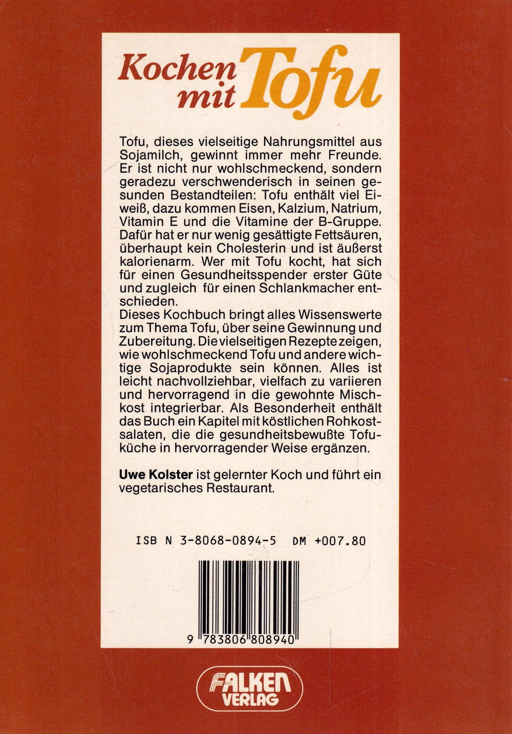 Dieses Kochbuch bringt alles Wissenswerte zum Thema Tofu, über seine Gewinnung und Zubereitung. Die vielseitigen Rezepte zeigen, wie wohlschmeckend Tofu und andere wichtige Sojaprodukte sein können. Alles ist leicht nachvollziehbar, vielfach zu variieren und hervorragend in die gewohnte Mischkost integrierbar. Als Besonderheit enthält das Buch ein Kapitel mit köstlichen Rohkostsalaten, die die gesundheitsbewusste Tofuküche in hervorragender Weise ergänzen.