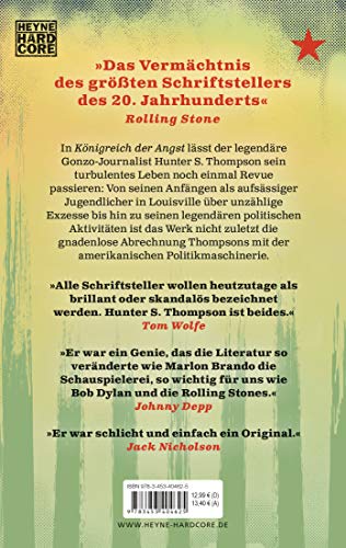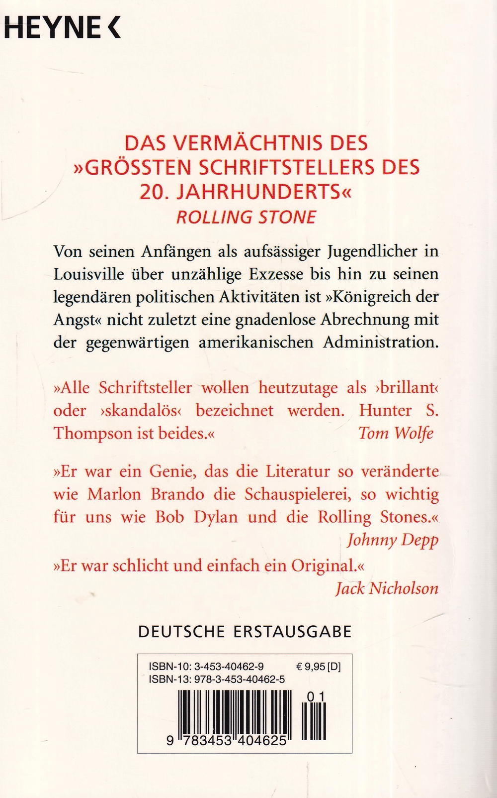 In seinen endlich auch auf Deutsch vorliegenden Memoiren lässt Hunter S. Thompson noch einmal sein turbulentes Leben Revue passieren. Von seinen Anfängen als aufsässiger Jugendlicher in Louisville über unzählige Exzesse bis hin zu seinen legendären politischen Aktivitäten ist Königreich der Angst nicht zuletzt eine gnadenlose Abrechnung mit der gegenwärtigen amerikanischen Administration.