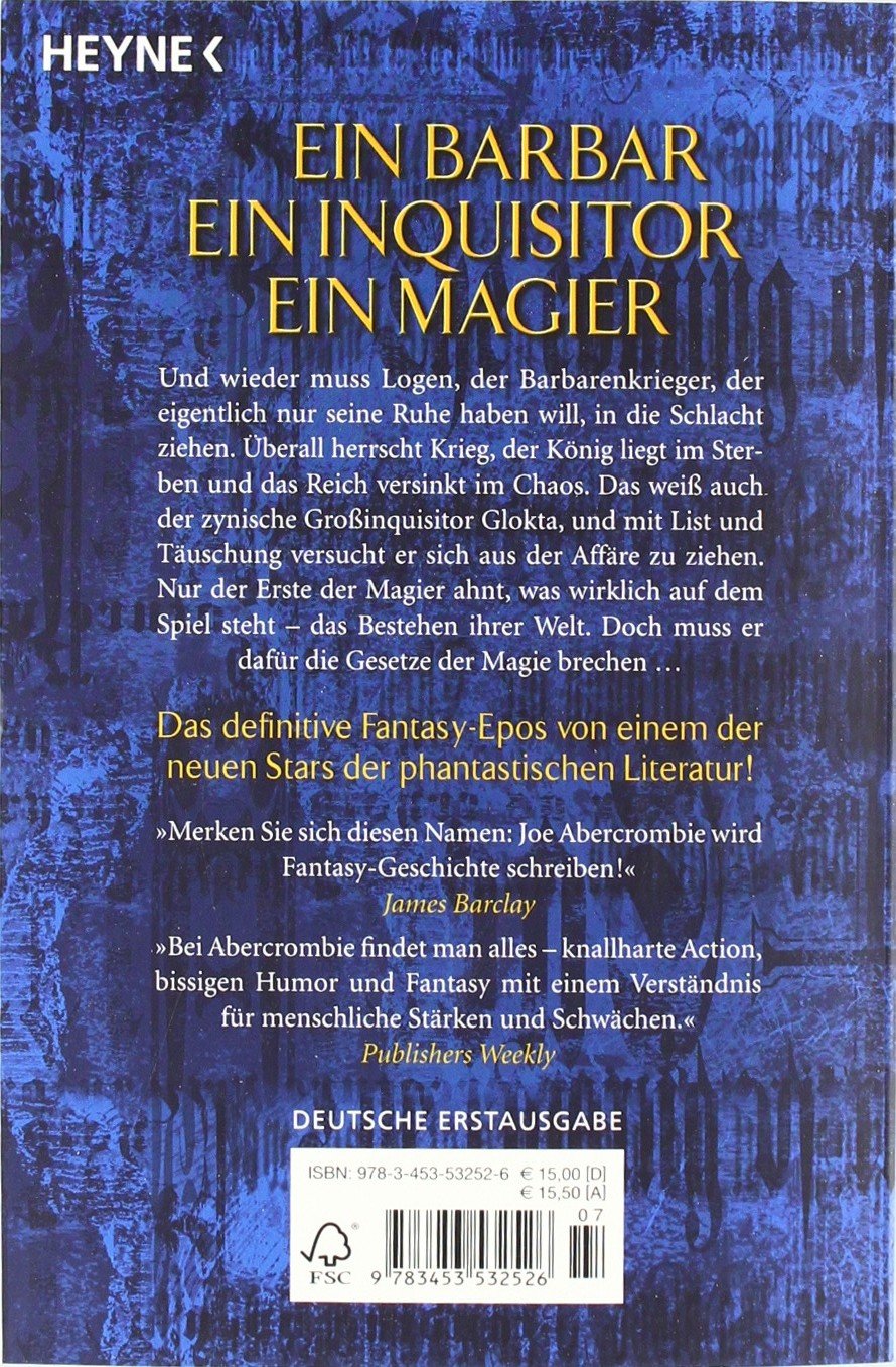 Für Logen, den Barbarenkrieger, sind die Zeiten siegreicher Schlachten vorbei – und dennoch steht ihm der grösste Kampf seines Lebens bevor ... Zu viele Herren und zu wenig Zeit haben den zynischen Inquisitor Glokta in ganz andere Schwierigkeiten gebracht – unversehens steht er im Zentrum eines tödlichen Geheimnisses ... Als die Schatten des Bösen auf das Land fallen, hat der Erste der Magier wie immer einen Plan zur Rettung der Welt – doch dieses Mal geht er ein schreckliches Risiko ein …