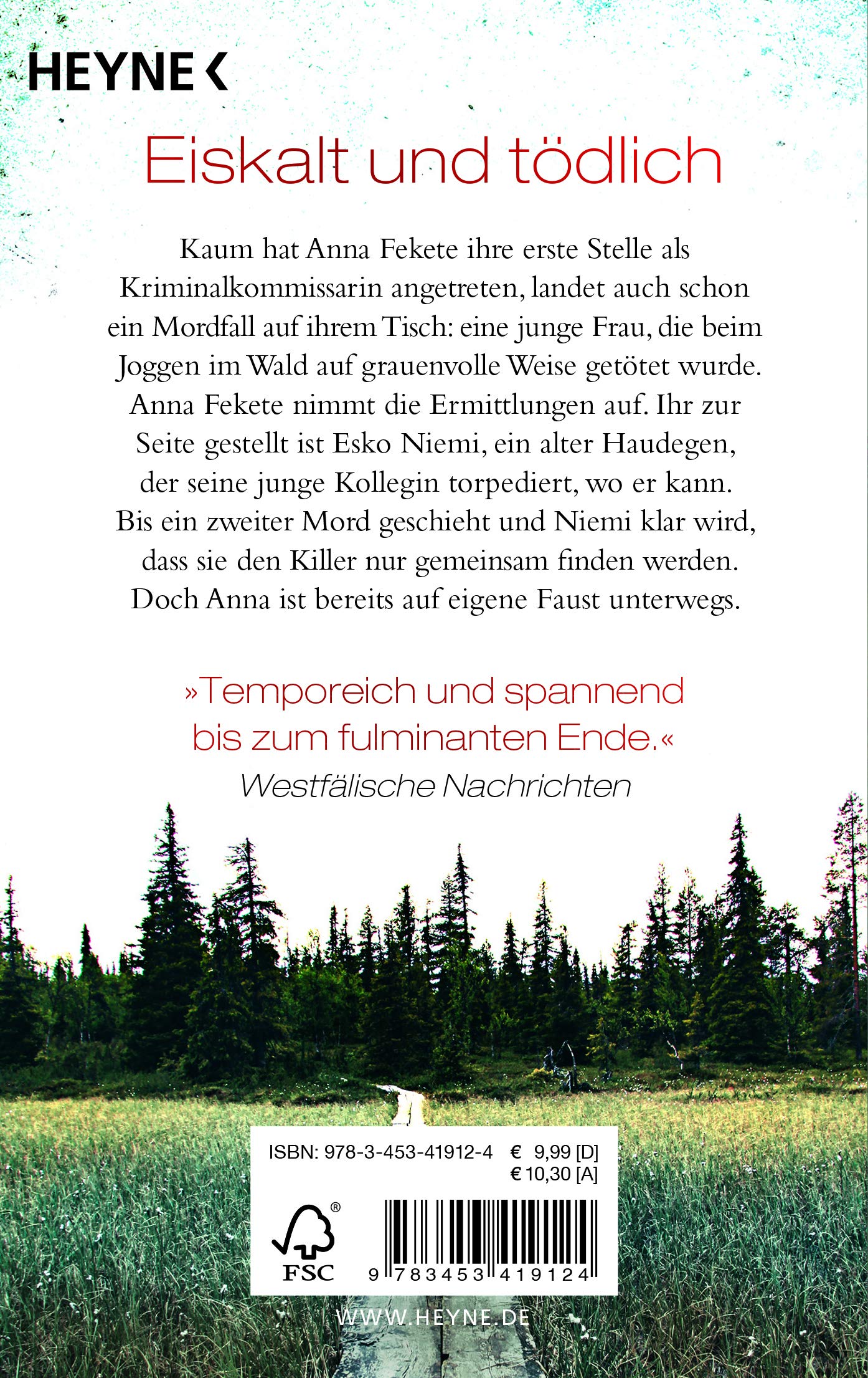 Kaum hat Anna Fekete ihre erste Stelle als Kriminalkommissarin angetreten, landet auch schon ein Mordfall auf ihrem Tisch: eine junge Frau, die beim Joggen im Wald auf grauenvolle Weise getötet wurde. Anna nimmt die Ermittlungen auf. Ihr zur Seite gestellt ist Esko Niemi, ein alter Haudegen, der seine junge Kollegin torpediert, wo er kann. Bis ein zweiter Mord geschieht und Esko klar wird, dass sie den Killer nur gemeinsam finden werden. Doch Anna ist bereits auf eigene Faust unterwegs.
