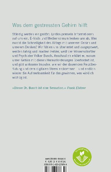 Das aktuelle Sachbuch zum Trendthema Überforderung und Konzentrations-Verlust: Der Neurologe und Psychiater Prof. Volker Busch präsentiert ein erprobtes Konzept zur Steigerung von Konzentration, Kreativität und Aufmerksamkeit - und damit auch zum Abbau von Stress. Unser stressiger Alltag ist heute voller Störungen: Unentwegt prasseln Informationen auf uns ein und verstopfen unseren Kopf, E-Mails und Medienkonsum lenken uns permanent ab, und die Schnelligkeit des Alltags macht unser Denken oberflächlich. Wir fühlen uns überlastet und ausgepowert, werden fahrig und machen Fehler. Die Aufmerksamkeit für das, was wirklich wichtig ist, geht verloren. Was braucht eigentlich unser Gehirn, um gut zu sein und gesund zu bleiben?