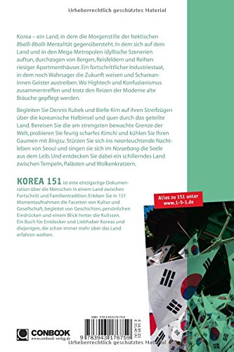 Korea 151 ist eine einzigartige Dokumentation über die Menschen in einem Land zwischen Fortschritt und Familientradition. Erleben Sie in 151 Momentaufnahmen die Facetten von Kultur und Gesellschaft, begleitet von Geschichten, persönlichen Eindrücken und einem Blick hinter die Kulissen. Ein Buch für Entdecker und Liebhaber Koreas und diejenigen, die schon immer mehr über das Land erfahren wollten.