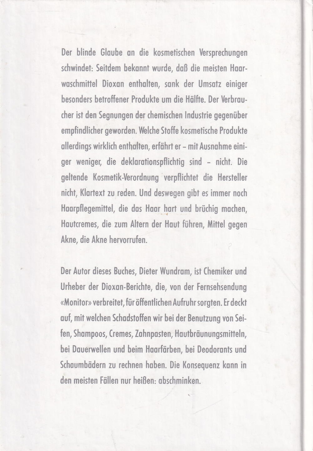 Der Autor dieses Buches, Dieter Wundram, ist Chemiker und Urheber der Dioxan-Berichte, die, von der Fernsehsendung «Monitor» verbreitet, für öffentlichen Aufruhr sorgten. Er deckt auf, mit welchen Schadstoffen wir bei der Benutzung von Seifen, Shampoos, Cremes, Zahnpasten, Hautbräunungsmitteln, bei Dauerwellen und beim Haarfärben, bei Deodorants und Schaumbädern zu rechnen haben. Die Konsequenz kann in den meisten Fällen nur heissen: abschminken.