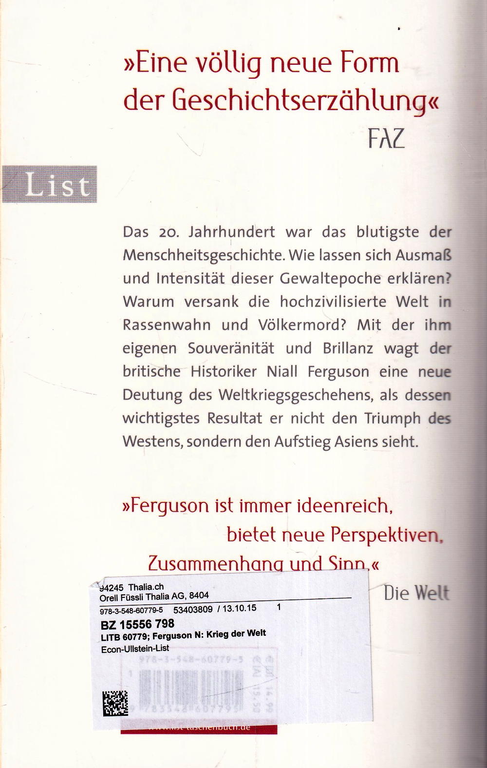 Das 20. Jahrhundert war das blutigste der Menschheitsgeschichte. Wie lassen sich Ausmass und Intensität dieser Gewaltepoche erklären? Warum versank die hochzivilisierte Welt in Rassenwahn und Völkermord? Mit der ihm eigenen Souveränität und Brillanz wagt der britische Historiker Niall Ferguson eine Deutung des Weltkriegsgeschehens, als dessen bedeutsamstes Resultat er nicht den Triumph des Westens, sondern den Aufstieg Asiens sieht.