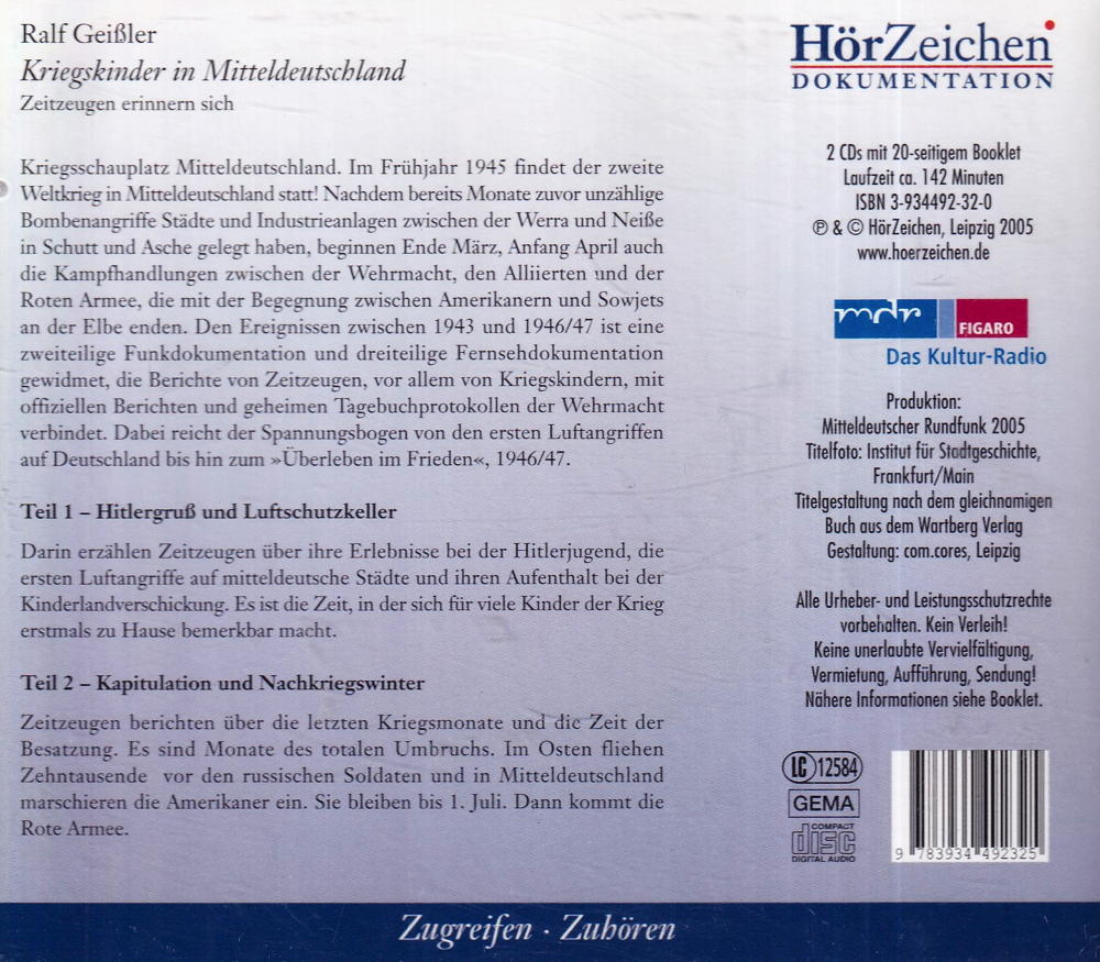 Kriegsschauplatz Mitteldeutschland. Den Ereignissen zwischen 1943 und 1946/47 ist eine zweiteilige Funkdokumentation gewidmet, die Berichte von Zeitzeugen, vor allem von Kriegskindern, mit offiziellen Berichten und geheimen Tagebuchprotokollen der Wehrmacht verbindet.