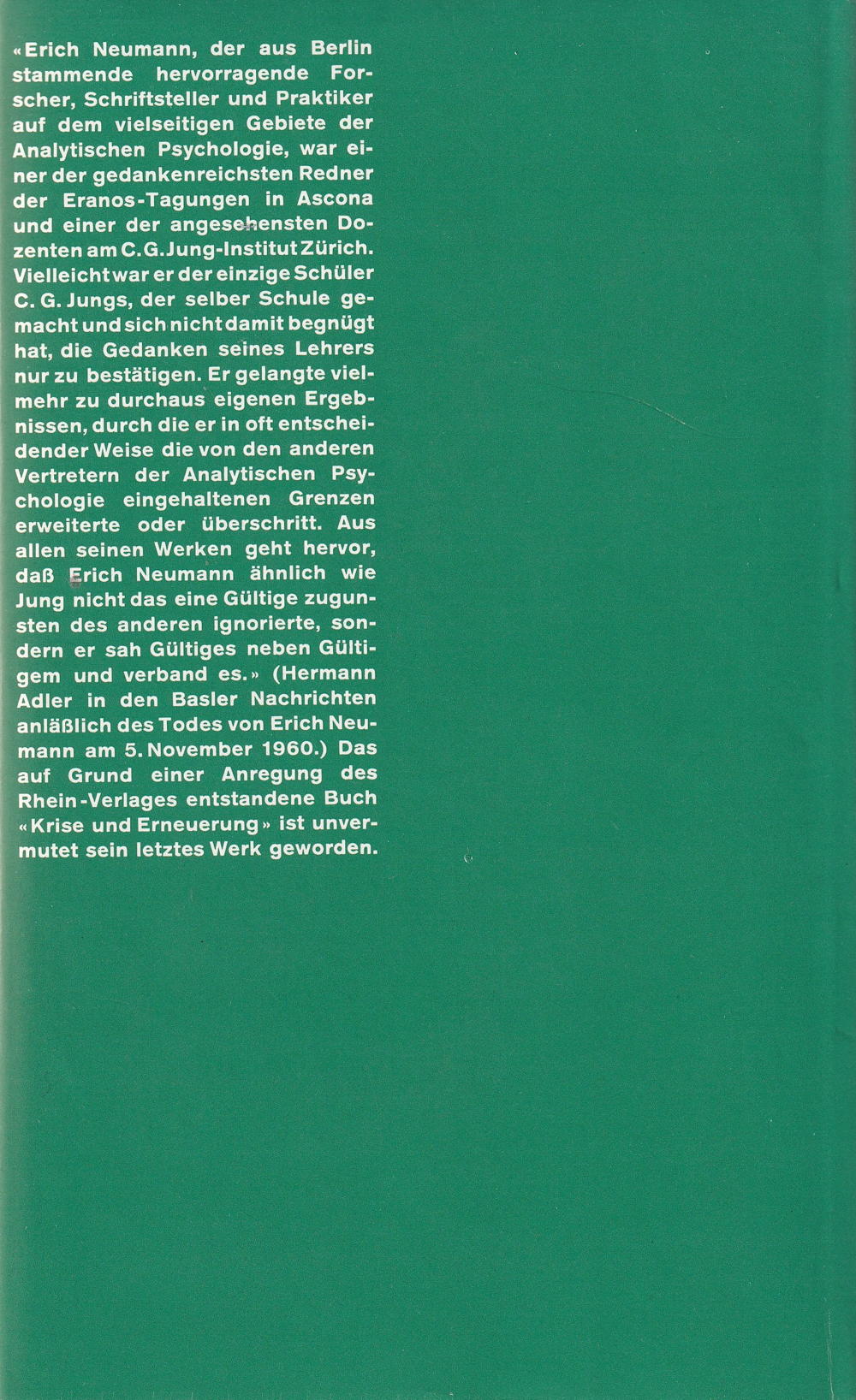 Vielleichtwar er der einzige Schüler C. G. Jungs, der selber Schule gemacht und sich nicht damit begnügt in Ascona hat, die Gedanken seines Lehrers bestätigen. Er gelangte vielmehr zu durchaus eigenen Ergebnur zu nissen, durch die er in oft entscheidender Weise die von den anderen Vertretern der Analytischen Psychologie eingehaltenen Grenzen erweiterte oder überschritt. Aus allen seinen Werken geht hervor, dass Erich Neumann ähnlich wie Jung nicht das eine Gültige zugunsten des anderen ignorierte, sondern er sah Gültiges neben Gültigem und verband es. » (Hermann Adler in den Basler Nachrichten anlässlich des Todes von Erich Neumann am 5. November 1960.) Das auf Grund einer Anregung des Rhein -Verlages entstandene Buch «Krise und Erneuerung" ist unvermutet sein letztes Werk geworden.