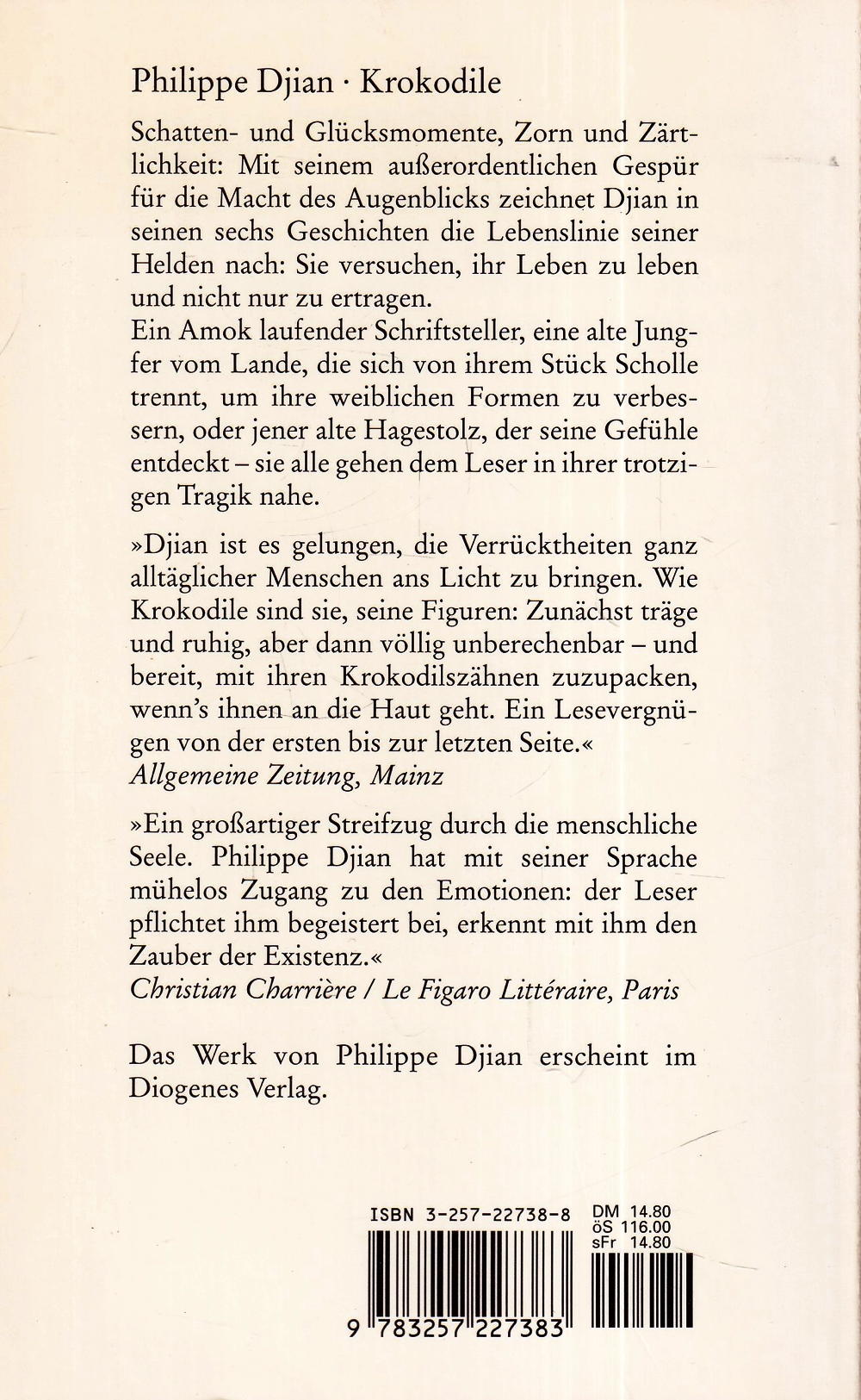 Philippe Djian, geboren 1949 in Paris, wechselte oft den Wohnsitz. Bisherige Stationen: New York, Florenz, Bordeaux, Biarritz, Lausanne und Paris. Auf einer Autobahnmautstelle, bei einem seiner Gelegenheitsjobs, tippte Djian seinen ersten Roman. Damals, in den achtziger Jahren, waren seine jugendlichen Protagonisten noch on the road, sein dritter Roman, Betty Blue, wurde zum Kultbuch. Heute sind seine Helden sesshaft geworden, aber noch immer sind sie auf der Suche nach Intensität und Leidenschaft.