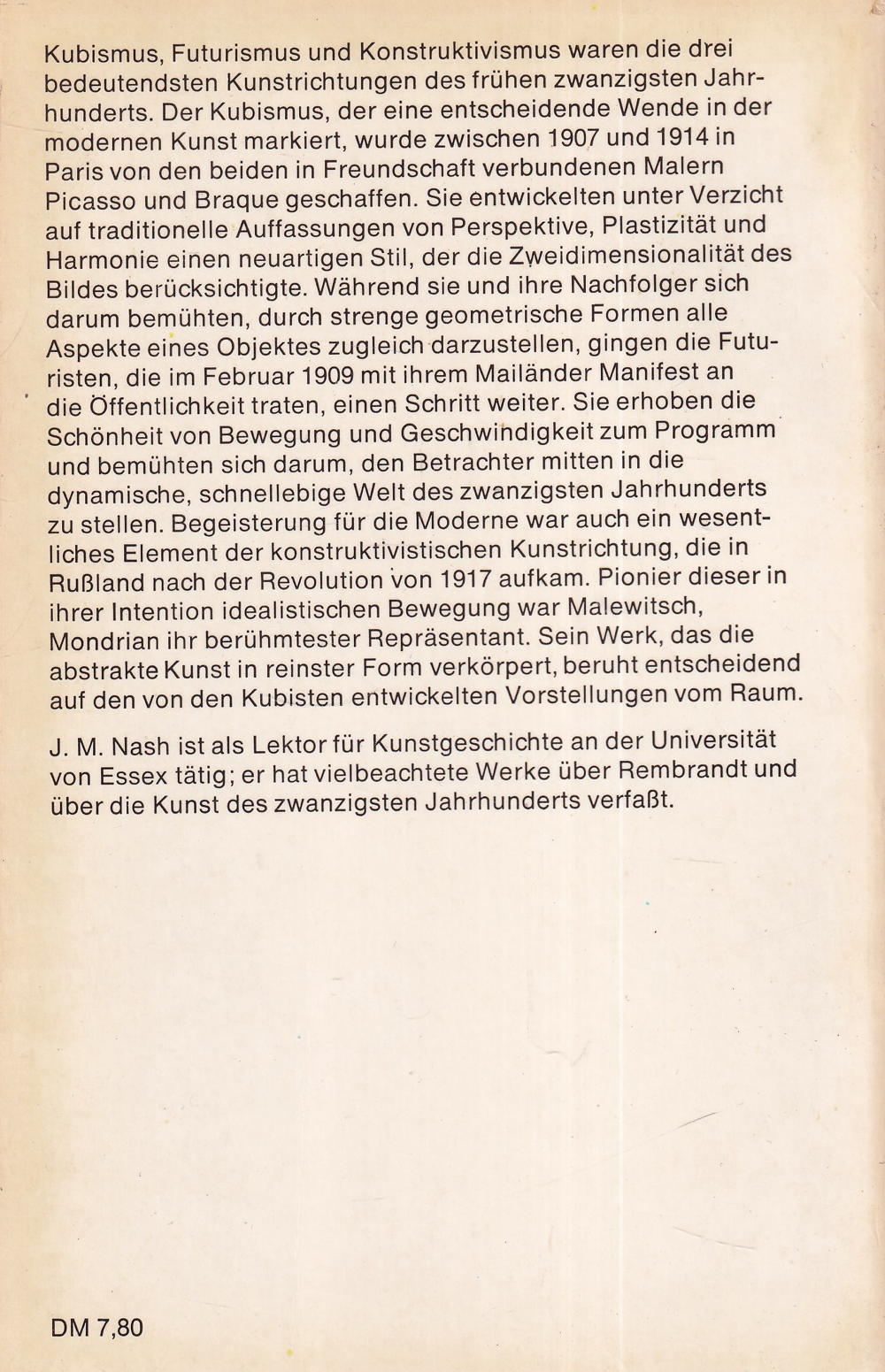 Kubismus, Futurismus und Konstruktivismus waren die drei bedeutendsten Kunstrichtungen des frühen zwanzigsten Jahrhunderts. Der Kubismus, der eine entscheidende Wende in der modernen Kunst markiert, wurde zwischen 1907 und 1914 in Paris von den beiden in Freundschaft verbundenen Malern Picasso und Braque geschaffen. Sie entwickelten unter Verzicht auf traditionelle Auffassungen von Perspektive, Plastizität und Harmonie einen neuartigen Stil, der die Zweidimensionalität des Bildes berücksichtigte. Während sie und ihre Nachfolger sich darum bemühten, durch strenge geometrische Formen alle Aspekte eines Objektes zugleich darzustellen, gingen die Futuristen, die im Februar 1909 mit ihrem Mailänder Manifest an die Öffentlichkeit traten, einen Schritt weiter. Sie erhoben die Schönheit von Bewegung und Geschwindigkeit zum Programm und bemühten sich darum, den Betrachter mitten in die dynamische, schnellebige Welt des zwanzigsten Jahrhunderts zu stellen. Begeisterung für die Moderne war auch ein wesentliches Element der konstruktivistischen Kunstrichtung, die in Russland nach der Revolution von 1917 aufkam. Pionier dieser in ihrer Intention idealistischen Bewegung war Malewitsch, Mondrian ihr berühmtester Repräsentant. Sein Werk, das die abstrakte Kunst in reinster Form verkörpert, beruht entscheidend auf den von den Kubisten entwickelten Vorstellungen vom Raum.