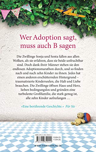 Die Zwillinge Sonja und Senta fallen aus allen Wolken, als sie erfahren, dass sie beide unfruchtbar sind. Doch dank ihrer Männer stehen sie den endlosen Adoptionsmarathon durch, und so finden nach und nach zehn Kinder zu ihnen. Jedes hat einen anderen erschütternden Hintergrund – traumatisierte Kinderseelen, die Halt und Liebe brauchen. Die Zwillinge öffnen Haus und Herz, lieben bedingungslos und gründen eine turbulente Grossfamilie, die stark genug ist, alle zehn Kinder aufzufangen …