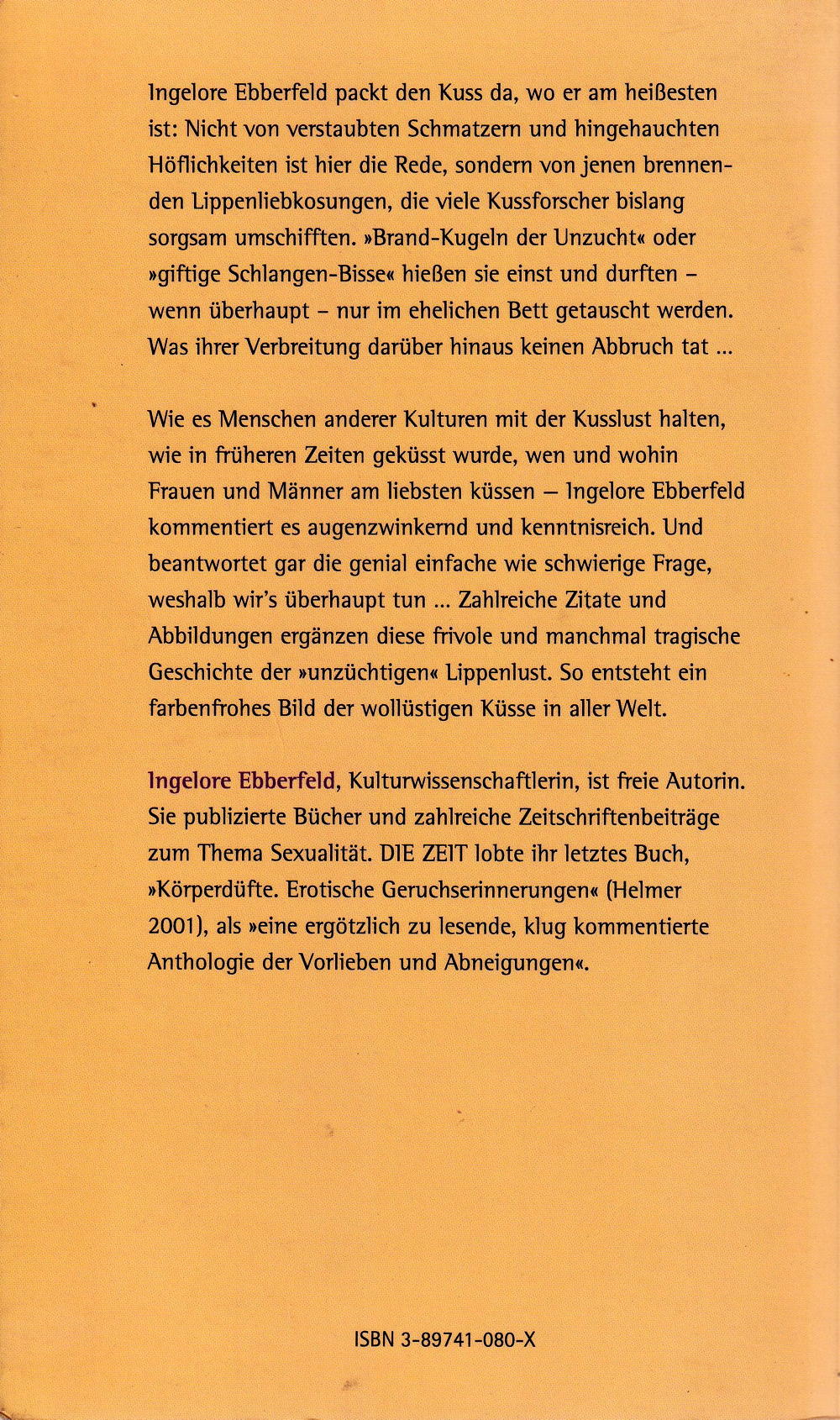 Ingelore Ebberfeld ist Dozentin für Kulturwissenschaft und freie Autorin in Bremen. Die renommierte Sexualwissenschaftlerin und Kulturanthropologin publizierte zahlreiche Zeitschriftenbeiträge und Bücher zum Thema Sexualität, darunter "Botenstoffe der Liebe. Über das innige Verhältnis von Geruch und Sexualität"; "Küss mich. Eine unterhaltsame Geschichte der wollüstigen Küsse" und "Das Kussbuch. Eine romantischeVerführung"; sie ist gefragte Referentin im In- und Ausland und bekannt durch Funk und Fernsehen.