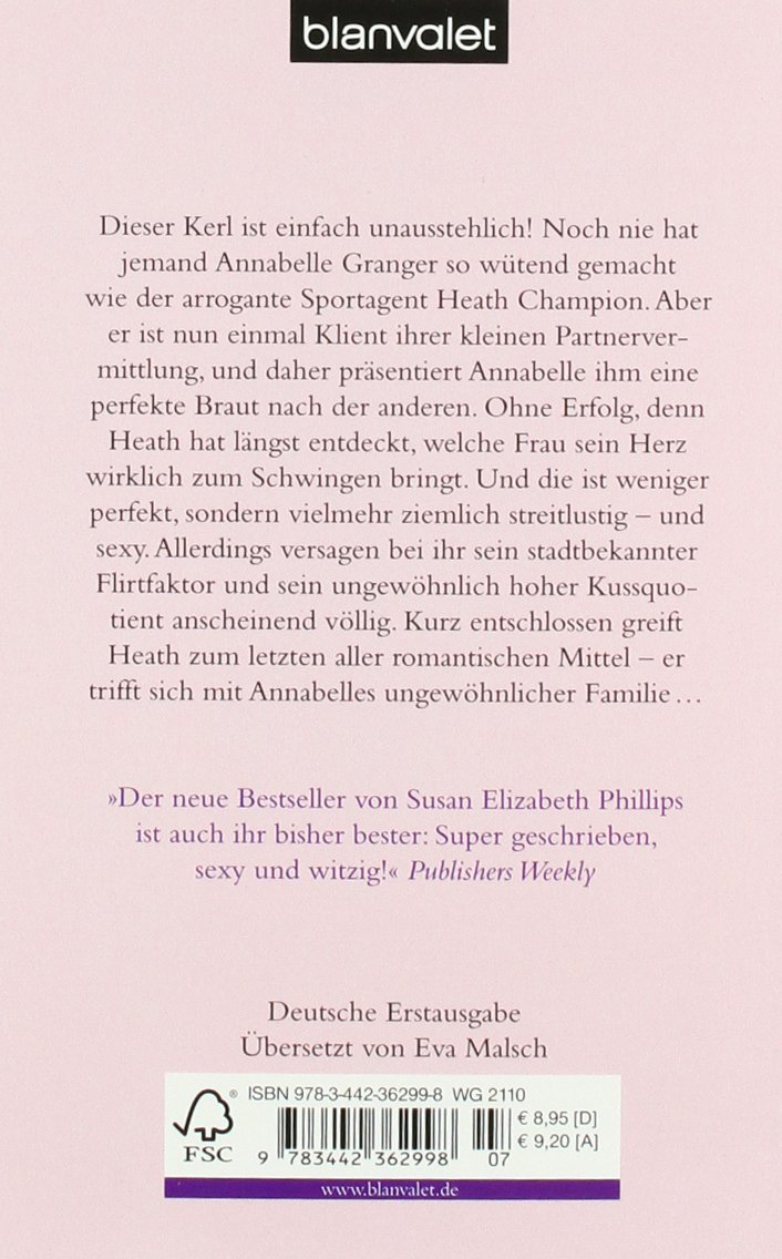 Dieser Kerl ist einfach unausstehlich! Noch nie hat Annabelle Granger jemand so wütend gemacht wie der arrogante Sportagent Heath Champion. Aber er ist nun einmal Klient ihrer kleinen Partnervermittlung und daher präsentiert Annabelle ihm eine perfekte Braut nach der anderen. Ohne Erfolg, denn Heath hat längst entdeckt, welche Frau sein Herz wirklich zum Schwingen bringt. Und die ist weniger perfekt, als vielmehr ziemlich streitlustig - und sexy. Doch sein stadtbekannter Flirtfaktor und sein ungewöhnlich hoher Kussquotient beeindrucken Annabelle nicht im Geringsten. Kurz entschlossen greift Heath zum letzten aller Mittel - er trifft sich mit Annabelles ungewöhnlicher Familie ...