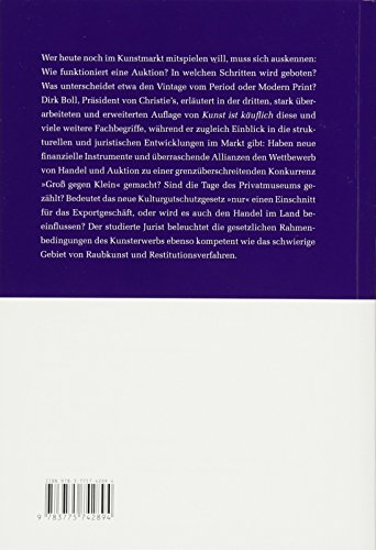 In den vergangenen fünf Jahren hat sich der Kunstmarkt in rasender Geschwindigkeit gewandelt. Wer heute noch mitspielen will, muss sich auskennen: Was unterscheidet den englischen vom holländischen Auktionstypus? Was den Vintage vom Period, Modern oder Estate Print? Dirk Boll, Geschäftsführer von Christie's in Zürich, erläutert diese und viele weitere Fachbegriffe, während er zugleich Einblicke in die strukturellen und juristischen Entwicklungen verschafft: Haben neue finanzielle Instrumente und überraschende Allianzen den Wettbewerb von Handel und Auktion zu einer grenzüberschreitenden Konkurrenz Gross gegen Klein gemacht? Bedeutet das gestiegene Engagement von Sammlern auch die Privatisierung von Kanonisierung, oder sind die Tage des Privatmuseums gezählt? Bedeutet das neue Kulturgüterschutzgesetz "nur" einen Einschnitt für das Exportgeschäft, oder wird es auch den Handel im Land beeinflussen? Der studierte Jurist beleuchtet die gesetzlichen Rahmenbedingungen des Kunsterwerbs ebenso kompetent wie das schwierige Gebiet der Raubkunst und Restitutionsverfahren.