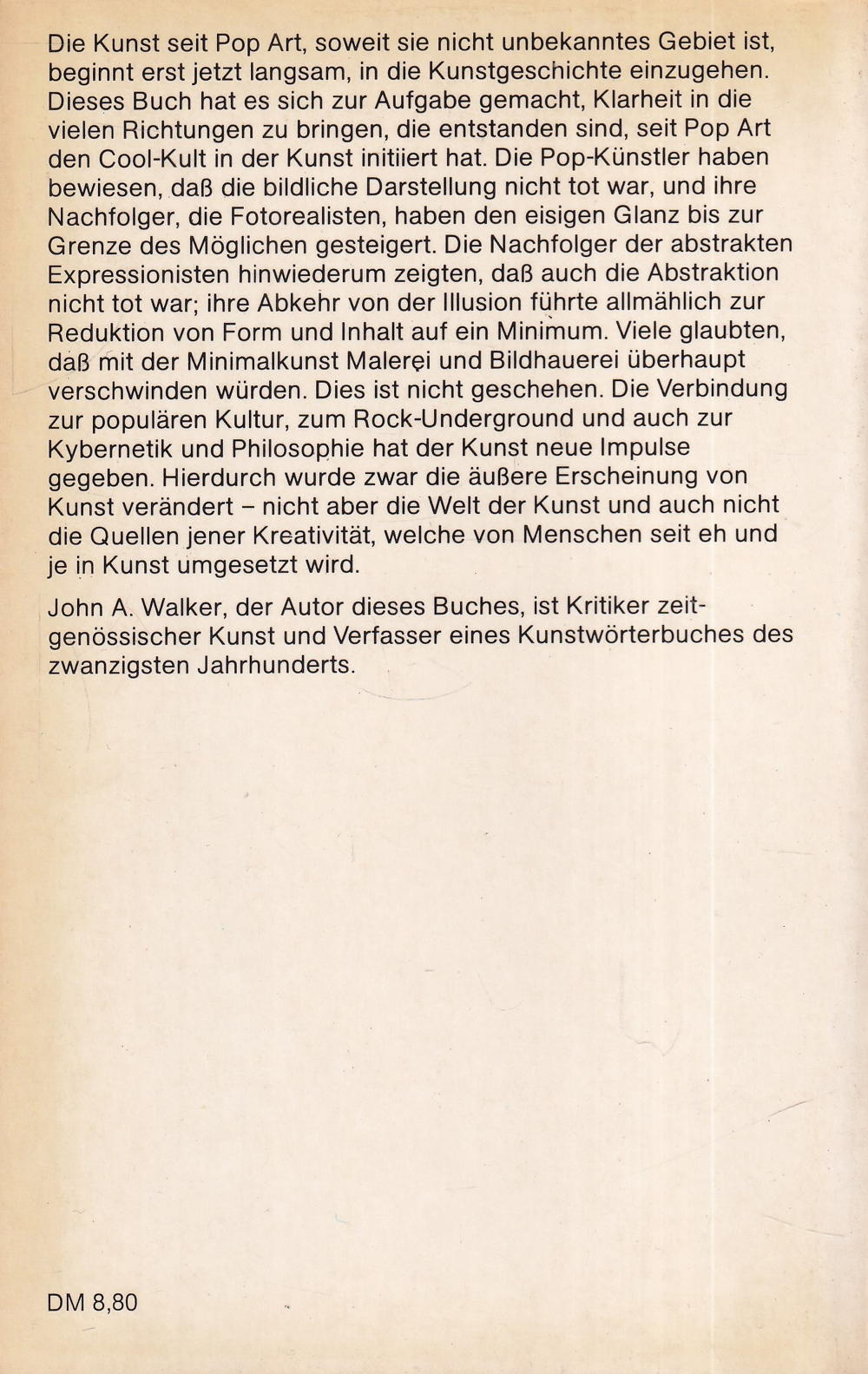 Dieses Buch hat es sich zur Aufgabe gemacht, Klarheit in die vielen Richtungen zu bringen, die entstanden sind, seit Pop Art den Cool-Kult in der Kunst initiiert hat. Die Pop-Künstler haben bewiesen, dass die bildliche Darstellung nicht tot war, und ihre Nachfolger, die Fotorealisten, haben den eisigen Glanz bis zur Grenze des Möglichen gesteigert. Die Nachfolger der abstrakten Expressionisten hinwiederum zeigten, dass auch die Abstraktion nicht tot war; ihre Abkehr von der Illusion führte allmählich zur Reduktion von Form und Inhalt auf ein Minimum. Viele glaubten, dass mit der Minimalkunst Malerei und Bildhauerei überhaupt verschwinden würden. Dies ist nicht geschehen. Die Verbindung zur populären Kultur, zum Rock-Underground und auch zur Kybernetik und Philosophie hat der Kunst neue Impulse gegeben. Hierdurch wurde zwar die äussere Erscheinung von Kunst verändert - nicht aber die Welt der Kunst und auch nicht die Quellen jener Kreativität, welche von Menschen seit eh und je in Kunst umgesetzt wird.