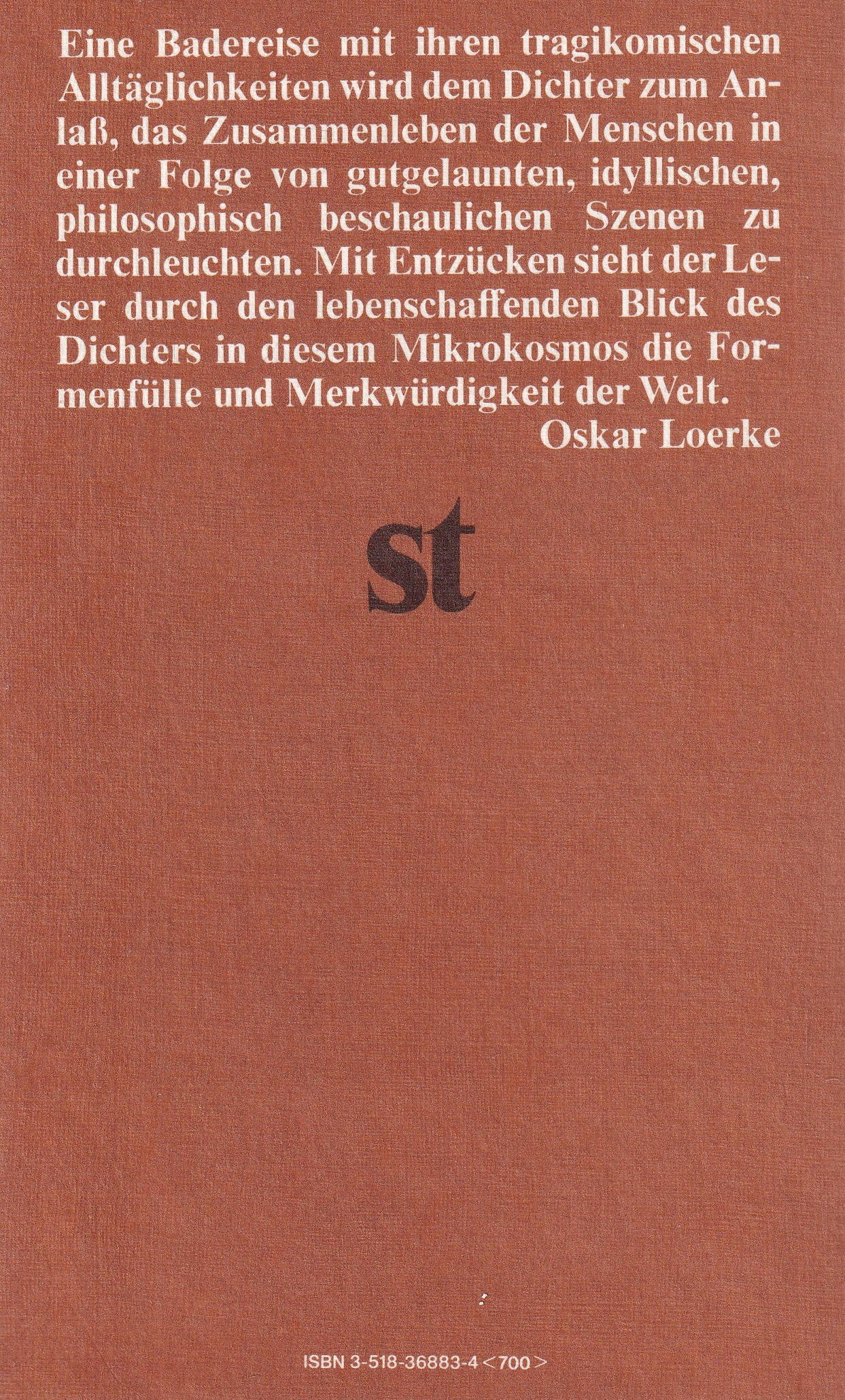 Eine Badereise mit ihren tragikomischen Alltäglichkeiten wird dem Dichter zum Anlass, das Zusammenleben der Menschen in einer Folge von gutgelaunten, idyllischen, philosophisch beschaulichen Szenen zu durchleuchten. Mit Entzücken sieht der Leser durch den lebenschaffenden Blick des Dichters in diesem Mikrokosmos die Formenfülle und Merkwürdigkeit der Welt.