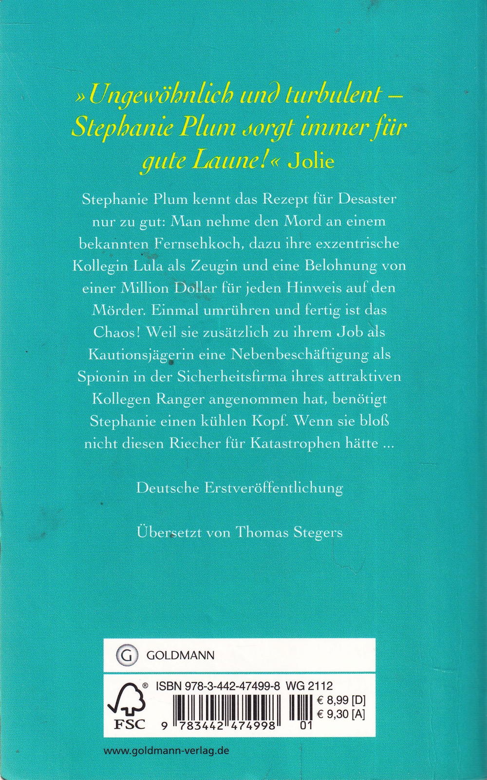 Stephanie Plum kennt das Rezept für Desaster nur zu gut: Man nehme den Mord an einem bekannten Fernsehkoch, dazu ihre exzentrische Kollegin Lula als Zeugin und eine Belohnung von einer Million Dollar für jeden Hinweis auf den Mörder. Einmal umrühren und fertig ist das Chaos! Weil sie zusätzlich zu ihrem Job als Kautionsjägerin eine Nebenbeschäftigung als Spionin in der Sicherheitsfirma ihres attraktiven Kollegen Ranger angenommen hat, benötigt Stephanie einen kühlen Kopf. Wenn sie bloss nicht diesen Riecher für Katastrophen hätte ...