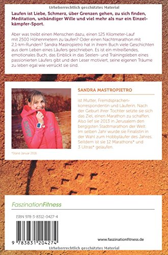 Laufen ist Liebe, Schmerz, über Grenzen gehen, zu sich finden, Meditation, unbändiger Wille und viel mehr als nur ein Einzelkämpfer-Sport. Aber was treibt einen Menschen dazu, einen 125 Kilometer-Lauf mit 2500 Höhenmetern zu laufen? Oder einen Nachtmarathon mit 2, 1-km-Runden? Sandra Mastropietro hat in ihrem Buch viele Geschichten aus dem Leben eines Läufers geschrieben. Es ist ein mitreissendes, emotionales Buch, das Einblick in das Seelen- und Trainingsleben eines passionierten Läufers gibt und den Leser motiviert, seine eigenen Träume zu leben egal wie verrückt sie sind.