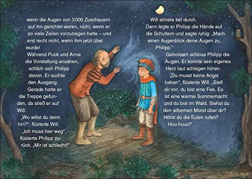 Wie aufregend! Anne und Philipp sind mit dem Baumhaus im Herzen Londons gelandet. Dort treffen sie auf William Shakespeare, der zwei Schauspieler für sein neues Theaterstück sucht. Dreitausend Menschen und sogar die Königin von England werden sich das Stück ansehen. Als Philipp schliesslich auf der grossen Bühne steht, bekommt er vor Aufregung kein Wort mehr heraus …