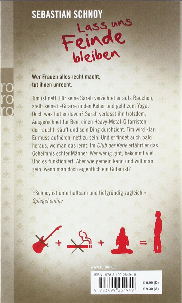 Tim ist nett. Für seine Sarah verzichtet er aufs Rauchen, stellt seine E-Gitarre in den Keller und geht zum Yoga. Doch was hat er davon? Sarah verlässt ihn trotzdem. Ausgerechnet für Ben, einen Heavy-Metal-Gitarristen, der raucht, säuft und sein Ding durchzieht. Tim wird klar: Er muss aufhören, nett zu sein. Und er findet auch bald heraus, wo man das lernt. Im Club der Kerle erfährt er das Geheimnis echter Männer: Wer wenig gibt, bekommt viel. Und es funktioniert. Aber wie gemein kann und will man sein, wenn man doch eigentlich ein Guter ist?