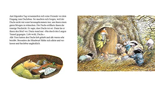 Jedes Tier kannte und liebte den alten Dachs: Er war immer zur Stelle gewesen, wenn jemand ihn brauchte. Nun ist der Dachs nicht mehr da - doch die schönen Erinnerungen an die Zeit, als er noch lebte, helfen seinen Freunden, den Tod zu akzeptieren und die Traurigkeit zu überwinden. Jedes Tier tut das auf seine eigene Art - und die Erinnerungen bleiben für immer.