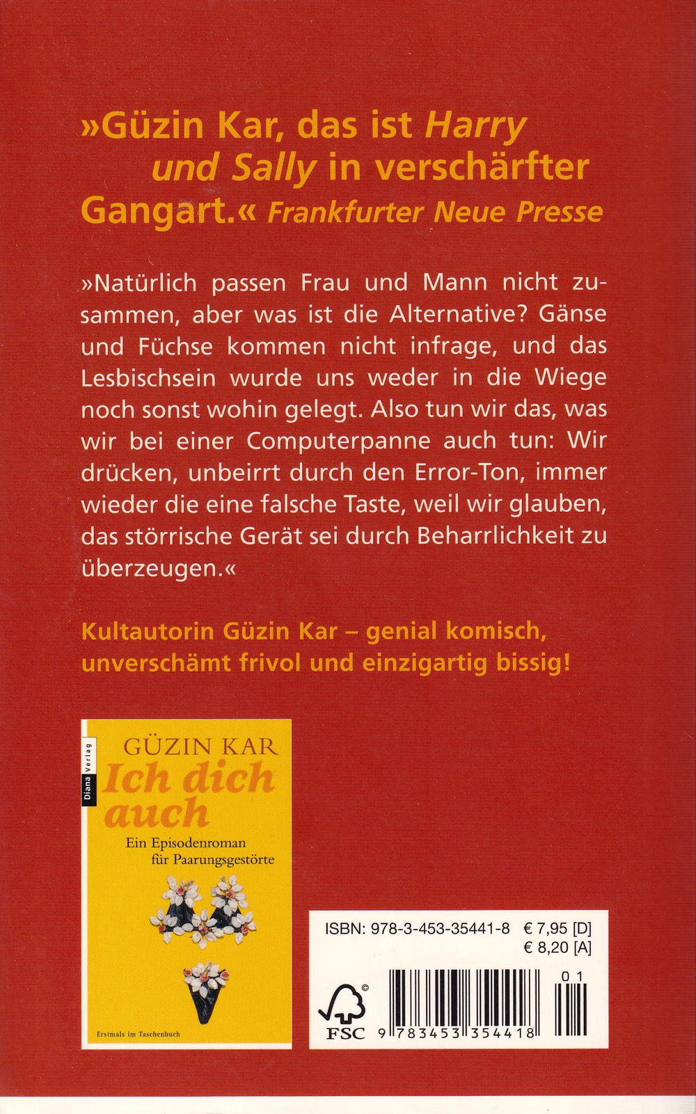 "Natürlich passen Frau und Mann nicht zusammen, aber was ist die Alternative? Gänse und Füchse kommen nicht infrage, und das Lesbischsein wurde uns weder in die Wiege noch sonst wohin gelegt. Also tun wir das, was wir bei einer Computerpanne auch tun: Wir drücken immer wieder die eine falsche Taste, weil wir glauben, das störrische Gerät sei durch Beharrlichkeit zu überzeugen."
