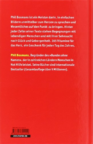 Phil Bosmans ist ein Meister darin, in einfachen Bildern Wesentliches auf den Punkt zu bringen und unmittelbar zum Herzen zu sprechen. Die Neuausgabe seines Jahreslesebuchs versammelt die schönsten Texte der Erstausgabe in besonders lesefreundlicher Schrift und farbiger Gestaltung. 365 Vitamine für das Herz, ein Geschenk für jeden Tag des Jahres.