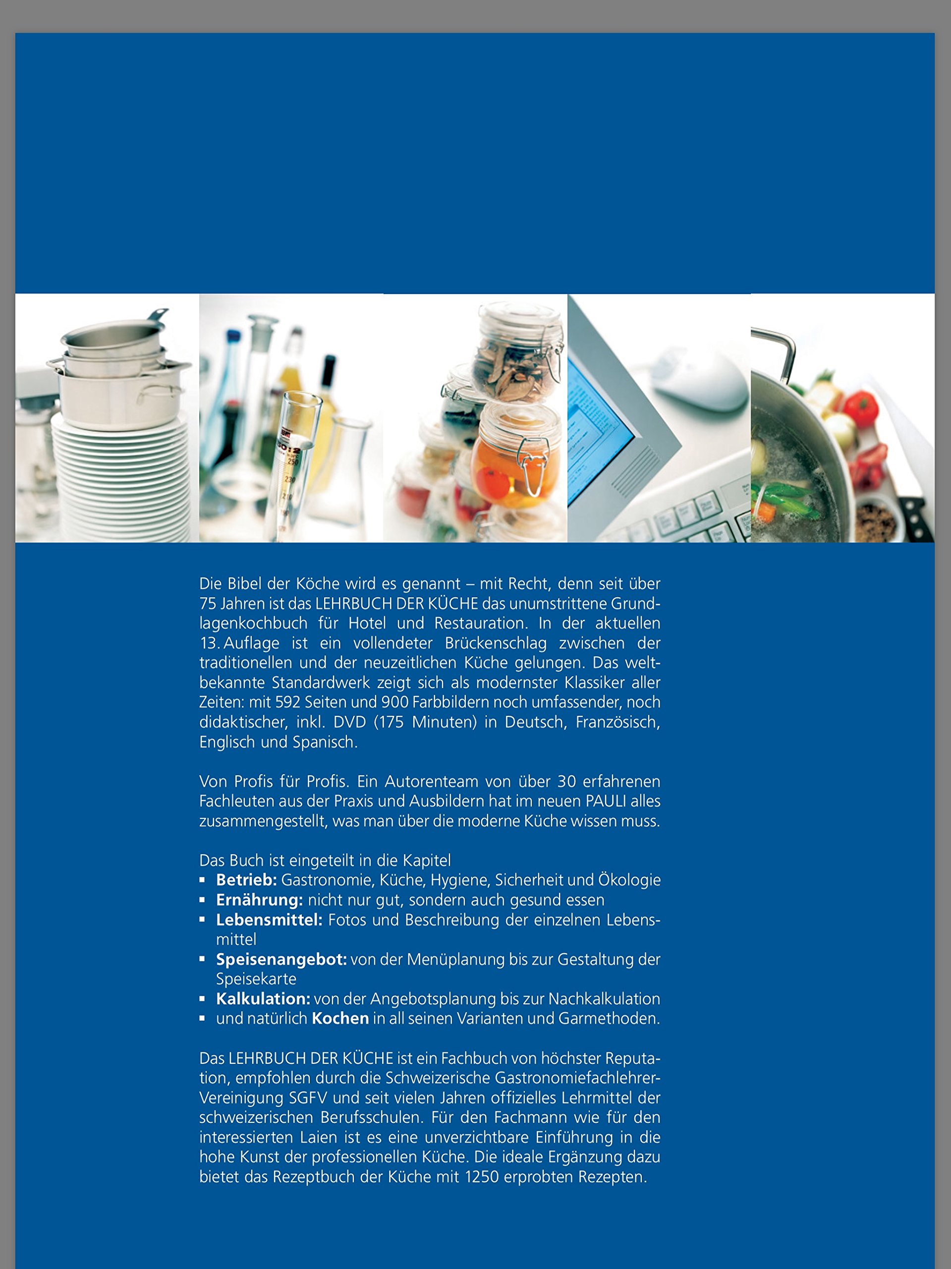 Die Bibel der Köche wird es genannt – mit Recht, denn seit über 75 Jahren ist das LEHRBUCH DER KÜCHE das unumstrittene Grundlagenkochbuch für Hotel und Restauration. In der aktuellen 13. Auflage ist ein vollendeter Brückenschlag zwischen der traditionellen und der neuzeitlichen Küche gelungen. Das weltbekannte Standardwerk zeigt sich als modernster Klassiker alle Zeiten, mit 900 Farbbildern, mit 592 Seiten noch umfassender, noch didaktischer, inkl. DVD (175 Minuten) in Deutsch, Französisch, Englisch und Spanisch. Das Buch ist eingeteilt in die Kapitel Betrieb: Gastronomie, Küche, Hygiene, Sicherheit und Ökologie Ernährung: nicht nur gut, sondern auch gesund essen Lebensmittel: Fotos und Beschreibung der einzelnen Lebensmittel Speisenangebot: von der Menüplanung bis zur Gestaltung der Speisekarte Kalkulation: von der Angebotsplanung bis zur Nachkalkulation Kochen: Grundlagen, alle Garmethoden, Warme und Kalte Küche, Süssspeisen Von Profis für Profis gemacht. Ein Autorenteam von über 30 erfahrenen Fachleuten hat im neuen PAULI alles zusammengestellt, was man über die moderne Küche wissen muss. Empfohlen durch die Schweizer Gastronomiefachlehrer-Vereinigung SGFV und seit vielen Jahren offizielles Lehrmittel der schweizerischen Berufsschulen ist das LEHRBUCH DER KÜCHE für den Fachmann wie für den interessierten Laien eine unverzichtbare Einführung in die hohe Kunst der professionellen Küche.