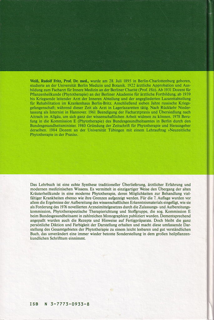 Weiss, Rudolf Fritz, Prof. Dr. Med., wurde am 28. Juli 1895 in Berlin-Charlottenburg geboren, studierte an der Universität Berlin Medizin und Botanik. 1922 ärztliche Approbation und Ausbildung zum Facharzt für Innere Medizin an der Berliner Charité (Prof. His). Ab 1931 Dozent für Pflanzenheilkunde (Phytotherapie) an der Berliner Akademie für ärztliche Fortbildung, ab 1939 bis Kriegsende leitender Arzt der Inneren Abteilung und der angegliederten Lazarettabteilung für Rehabilitation im Krankenhaus Berlin-Britz. Anschliessend sieben Jahre russische Kriegsgefangenschaft; während dieser Zeit als Arzt in Lagerlazaretten tätig. Nach Rückkehr Niederlassung als Internist in Hannover. 1961 Beendigung der Facharztpraxis und Übersiedlung nach Aitrach im Allgäu, um sich ganz der wissenschaftlichen Arbeit widmen zu können. 1978 Berufung in die Kommission E (Phytotherapie) des Bundesgesundheitsamtes in Berlin durch den Bundesgesundheitsminister. 1980 Gründung der Zeitschrift für Phytotherapie und Herausgeber derselben. 1984 Dozent an der Universität Tübingen mit einem Lehrauftrag »Neuzeitliche Phytotherapie in der Praxis«.