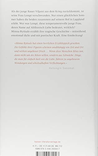 Der junge Bauernsohn Viljami hat sich in Lempi, die Tochter des Ladenbesitzers aus der kleinen Stadt Rovaniemi in Lappland, verliebt. Hals über Kopf heiraten sie, und Lempi, der das Landleben fremd ist, zieht zu Viljami auf den Hof. Um sie zu entlasten, stellt ihr Mann die Magd Elli ein, die insgeheim selbst gern an seiner Seite wäre. Nach einem einzigen glücklichen Sommer wird Viljami 1943 zum Kriegsdienst eingezogen. Als er zurückkehrt, ist die Stadt zerstört und Lempi verschwunden. Dass sie wie ihre Zwillingsschwester mit einem Offizier nach Deutschland gegangen sei, kann er sich nicht vorstellen. Vielschichtig, emotional und mitreissend erzählt Minna Rytisalo in ihrem Debütroman von der Liebe.