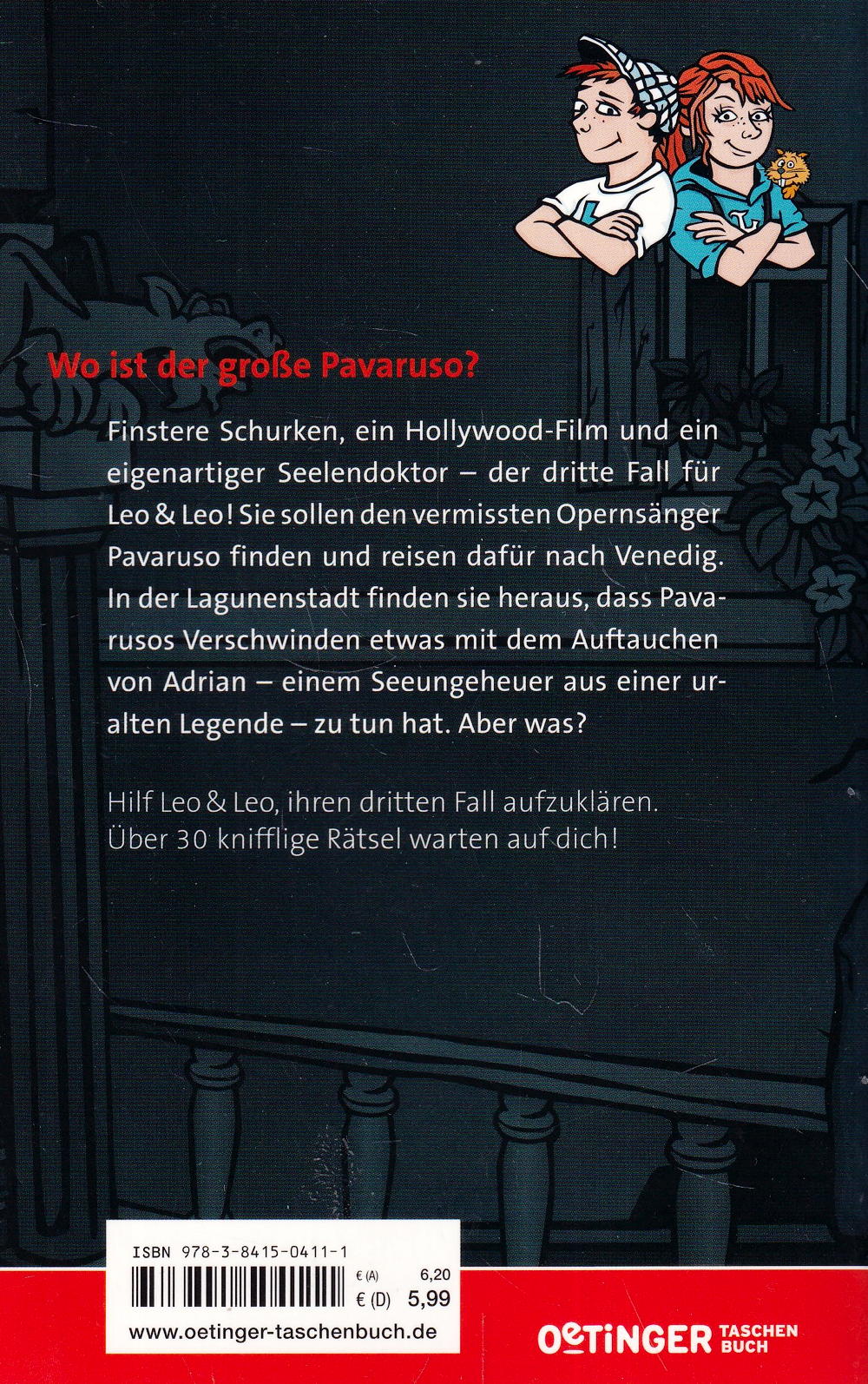 Eine ungeheuerliche Entdeckung! Die Detektiv-Agentur der Zwillinge Leonie und Leonard bekommt es mit einem ganz besonders mysteriösen Fall zu tun, der sie nach Venedig verschlägt, in die Heimatstadt des verschwundenen Meistersängers Pavaruso. Hier landen sie bei einer quirligen Hochzeit, auf dem Sofa eines Seelendoktors, in einem Hollywood-Film und schliesslich im trüben Wasser der Lagune. Doch was das Verschwinden des grossen Pavaruso anbelangt, fischen die Detektive nicht lange im Trüben. Schon bald stossen sie auf einen Zusammenhang mit der uralten Legende eines Seeungeheuers.
