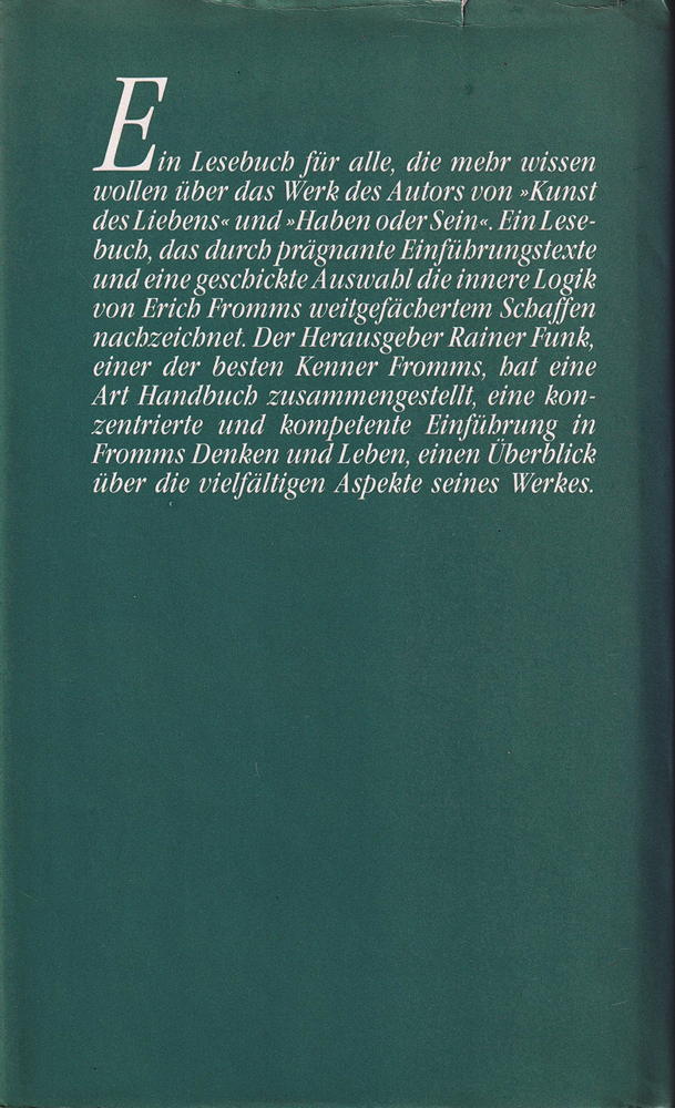 Ein Lesebuch für alle, die mehr wissen wollen über das Werk des Autors von »Kunst des Liebens« und »Haben oder Sein«. Ein Lesebuch, das durch prägnante Einführungstexte und eine geschickte Auswahl die innere Logik von Erich Fromms weitgefächertem Schaffen nachzeichnet. Der Herausgeber Rainer Funk, einer der besten Kenner Fromms, hat eine Art Handbuch zusammengestellt, eine konzentrierte und kompetente Einführung in Fromms Denken und Leben, einen Überblick über die vielfältigen Aspekte seines Werkes.