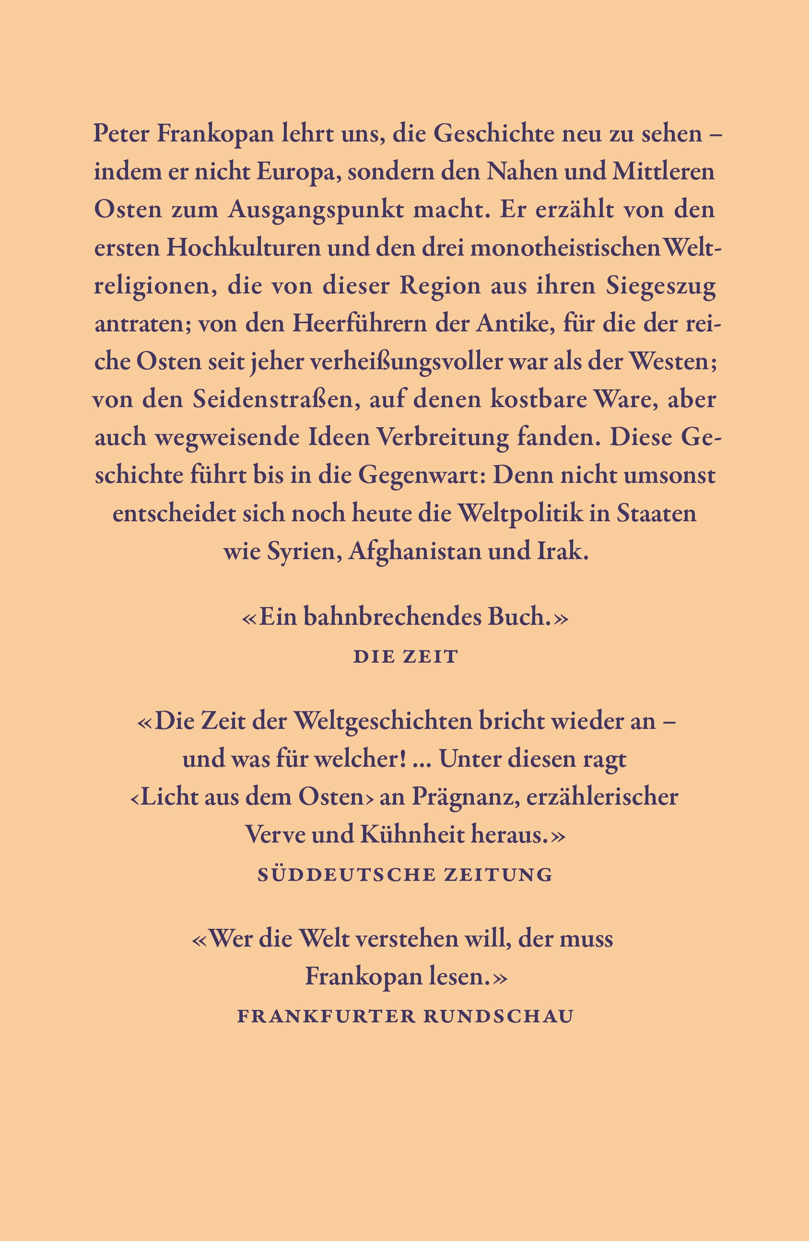 Peter Frankopan schlägt einen weiten Bogen, und das nicht nur zeitlich: Er rückt zwei Welten zusammen, Orient und Okzident, die historisch viel enger miteinander verbunden sind, als wir glauben. Ein so fundiertes wie packend erzähltes Geschichtswerk, das wahrhaft die Augen öffnet.
