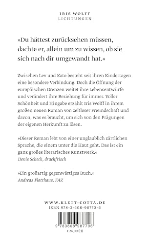 Zwischen Lev und Kato besteht seit ihren Kindertagen eine besondere Verbindung. Doch die Öffnung der europäischen Grenzen weitet ihre Lebensentwürfe und verändert ihre Beziehung für immer. Voller Schönheit und Hingabe erzählt Iris Wolff in ihrem grossen neuen Roman von zeitloser Freundschaft und davon, was es braucht, um sich von den Prägungen der eigenen Herkunft zu lösen. Als der elfjährige Lev über Wochen ans Bett gefesselt ist, wird ausgerechnet die gescheite, aber von allen gemiedene Kato zu ihm ans Krankenbett geschickt, um ihm die Hausaufgaben zu bringen. Zwischen dem ungleichen Paar entsteht eine unverbrüchliche Verbindung, die Lev aus seiner Versteinerung löst und den beiden Heranwachsenden im kommunistischen Vielvölkerstaat Rumänien einen Halt bietet. Ein halbes Leben später läuft Lev noch immer die Pfade ihrer Kindheit ab, während Kato schon vor Jahren in den Westen aufgebrochen ist. Geblieben sind Lev nur ihre gezeichneten Postkarten aus ganz Europa. Bis ihn eines Tages eine Karte aus Zürich erreicht, darauf nur ein einziger Satz: »Wann kommst du?« Kunstvoll und poetisch verwandelt Iris Wolff jenen Moment in Sprache, wenn ein Leben ans andere rührt, und zeichnet in ihrem grossen europäischen Roman das Porträt einer berührenden Freundschaft, die sich als Reise in die Vergangenheit offenbart und deren Leuchten noch lange nachklingt.