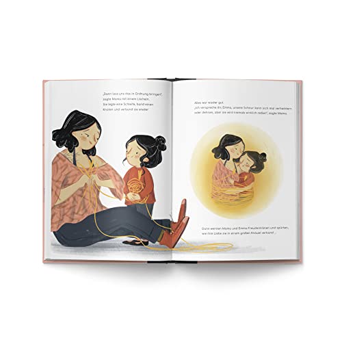Emma ist umgeben von Liebe. Sie liebt ihre Mama, ihren Papa, ihren Bruder Ben und ihren Hund Krümel. Wenn sie Oma und Opa besucht, ist die Liebe, die sie beim letzten Mal dort gelassen hatte, noch da. Als Emma eingeschult wird, muss sie zum ersten Mal das Haus al-leine verlassen. Wird die Liebe ihrer Familie sie auch in der Grundschule erreichen? Da er-klärt ihre Mama, dass Liebe wie eine Schnur ist: Sie verbindet zwei Menschen, egal wie weit entfernt sie voneinander sind. Es gibt alte Schnüre, neue Schnüre und Schnüre, die ganz weit reichen. Und das wichtigste: Eine Schnur kann sich mal verheddern oder dehnen, aber sie wird niemals reissen. Mit diesem Bilderbuch möchte die preisgekrönte Kinderbuchautorin Corrinne Averiss Kindern Mut machen. Ihre Vorlese-Geschichte zeigt, dass Liebe Familien verbindet, egal wie weit man voneinander entfernt ist.