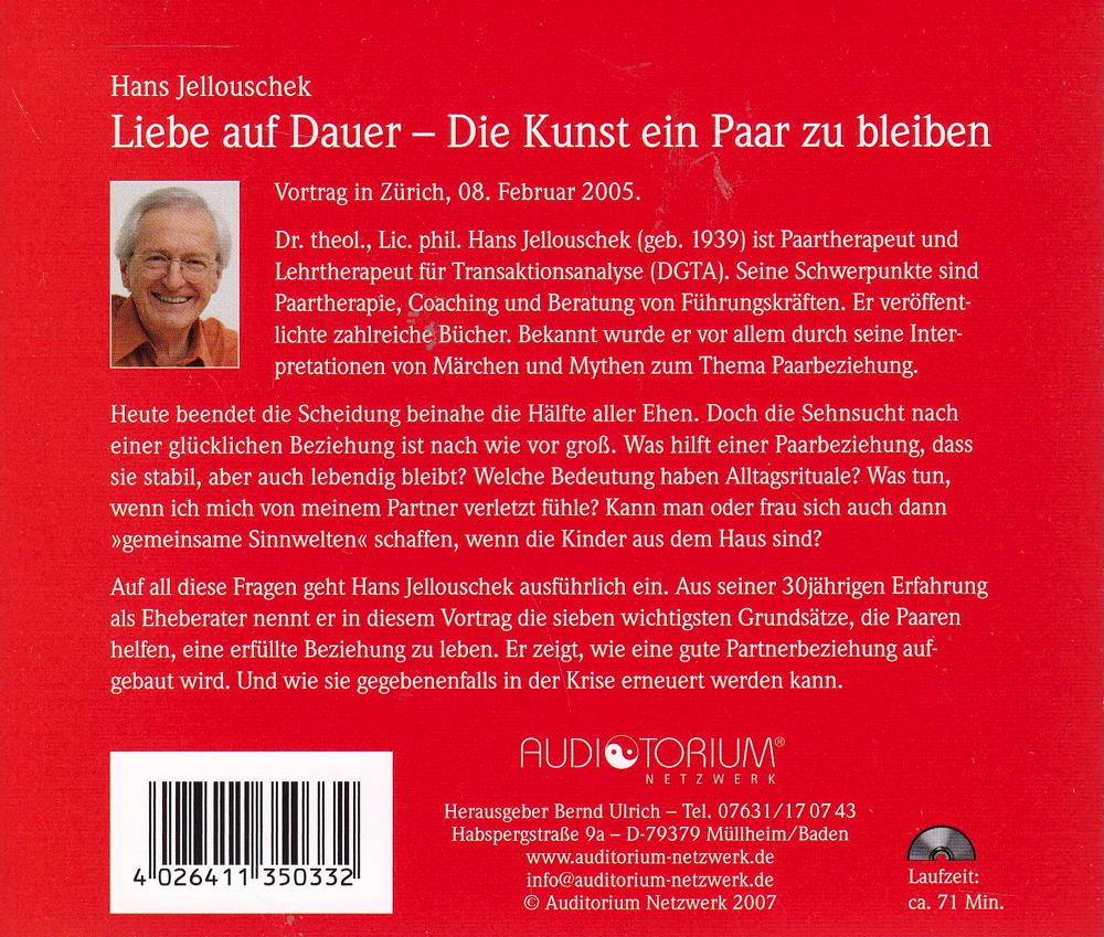Auf all diese Fragen geht Hans Jellouschek ausführlich ein. Aus seiner 30 jährigen Erfahrung als Eheberater nennt er in diesem Vortrag die sieben wichtigsten Grundsätze, die Paaren helfen, eine erfüllte Beziehung zu leben. Er zeigt, wie eine gute Partnerbeziehung aufgebaut wird. Und wie sie gegebenenfalls in der Krise erneuert werden kann.
