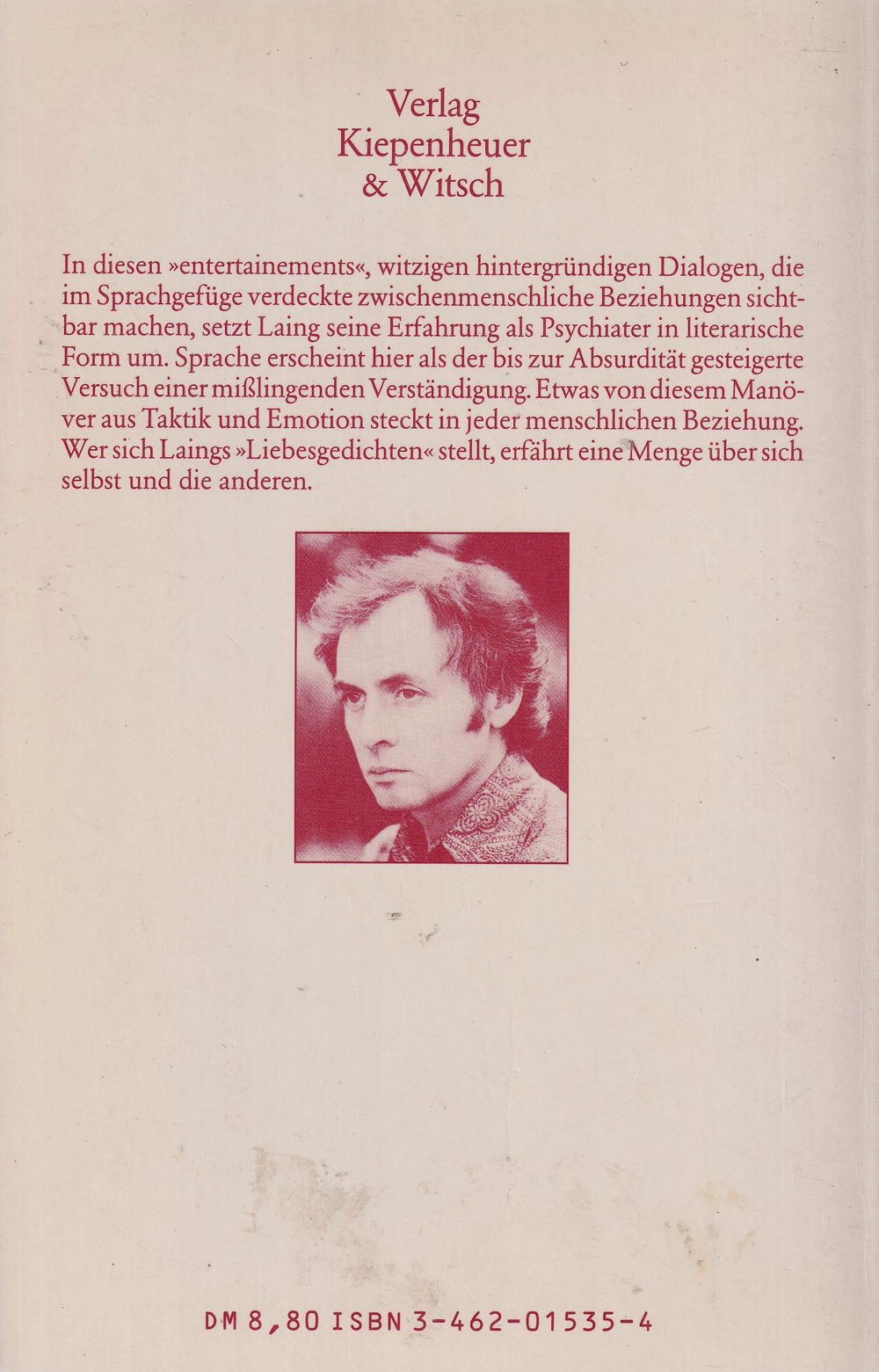 In diesen »entertainements«, witzigen hintergründigen Dialogen, die im Sprachgefüge verdeckte zwischenmenschliche Beziehungen sichtbar machen, setzt Laing seine Erfahrung als Psychiater in literarische Form um. Sprache erscheint hier als der bis zur Absurdität gesteigerte Versuch einer misslingenden Verständigung. Etwas von diesem Manöver aus Taktik und Emotion steckt in jeder menschlichen Beziehung. Wer sich Laings »Liebesgedichten« stellt, erfährt eine Menge über sich selbst und die anderen.