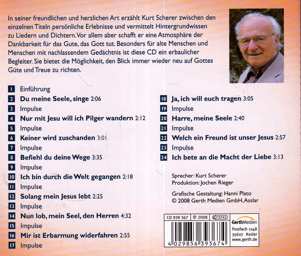 In seiner freundlichen und herzlichen Art erzählt Kurt Scherer zwischen den einzelnen Titeln persönliche Erlebnisse und vermittelt Hintergrundwissen zu Liedern und Dichtern. Vor allem aber schafft er eine Atmosphäre der Dankbarkeit für das Gute, das Gott tut. Besonders für alte Menschen und Menschen mit nachlassendem Gedächtnis ist diese CD ein erbaulicher Begleiter. Sie bietet die Möglichkeit, den Blick immer wieder neu auf Gottes Güte und Treue zu richten.