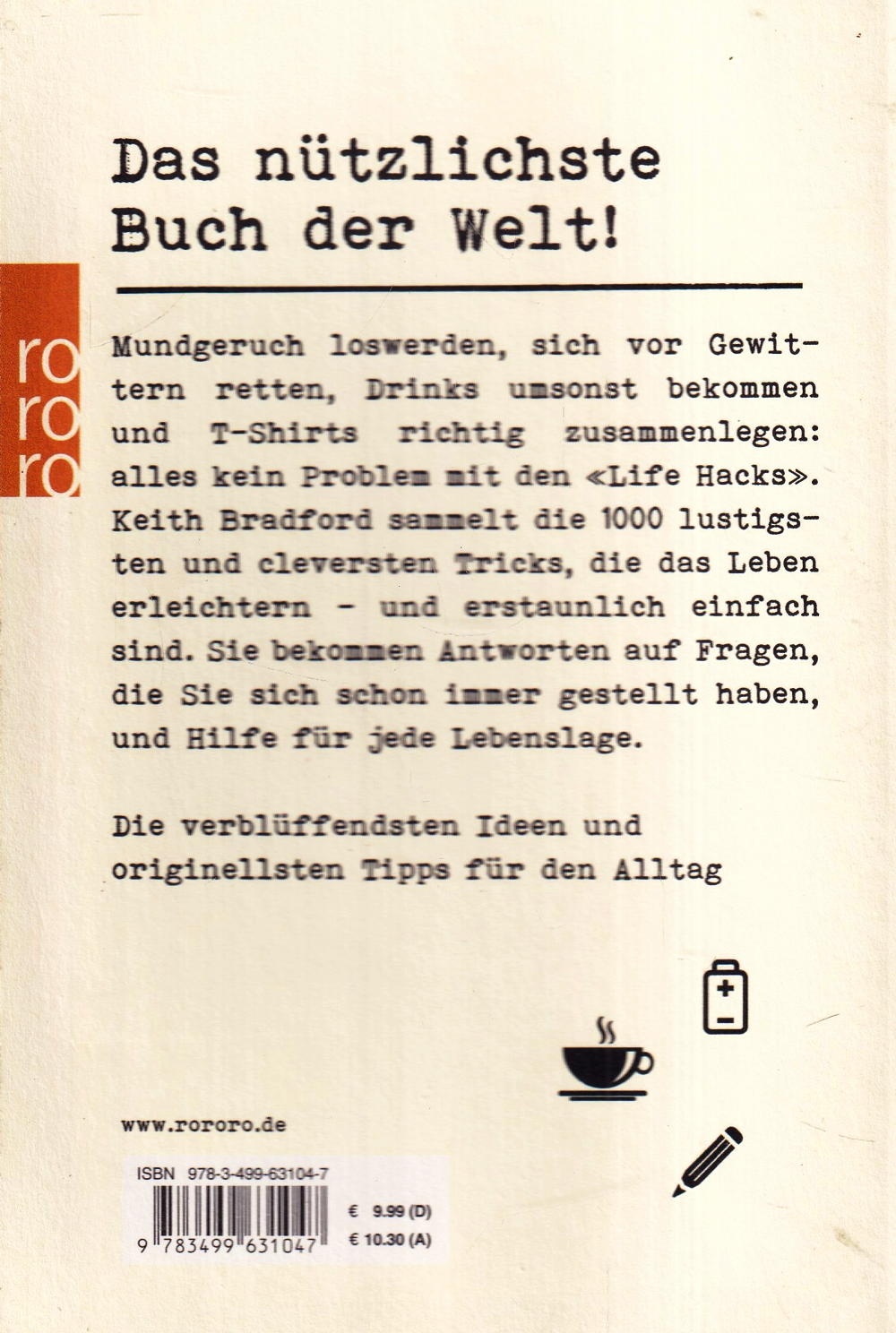 Mundgeruch loswerden, sich vor Gewittern retten, Glasscherben gefahrlos aufhebt, Wespenstiche behandeln und Bier in zwei Minuten kühlen: alles kein Problem mit den "Life Hacks". Keith Bradford sammelt die 1000 lustigsten und cleversten Tricks, die das Leben erleichtern - und erstaunlich einfach sind. Sie bekommen Antworten auf Fragen, die Sie sich schon immer gestellt haben, und Hilfe für jede Lebenslage.