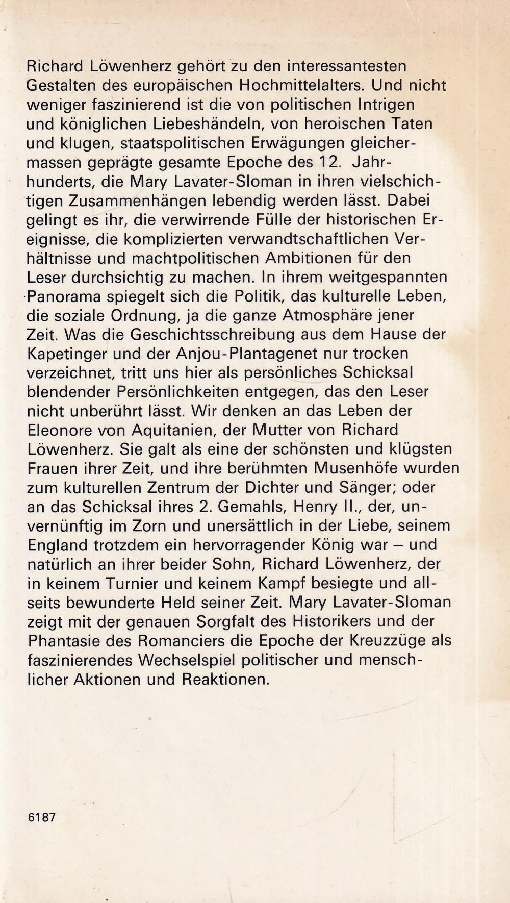 Richard Löwenherz gehört zu den interessantesten Gestalten des europäischen Hochmittelalters. Und nicht weniger faszinierend ist die von politischen Intrigen und königlichen Liebeshändeln, von heroischen Taten und klugen, staatspolitischen Erwägungen gleichermassen geprägte gesamte Epoche des 12. Jahrhunderts, die Mary Lavater-Sloman in ihren vielschichtigen Zusammenhängen lebendig werden lässt. Dabei gelingt es ihr, die verwirrende Fülle der historischen Ereignisse, die komplizierten verwandtschaftlichen Verhältnisse und machtpolitischen Ambitionen für den Leser durchsichtig zu machen. In ihrem weitgespannten Panorama iegelt sich die Politik, das kulturelle Leben, die soziale Ordnung, ja die ganze Atmosphäre jener Zeit. Was die Geschichtsschreibung aus dem Hause der Kapetinger und der Anjou-Plantagenet nur trocken verzeichnet, tritt uns hier als persönliches Schicksal blendender Persönlichkeiten entgegen, das den Leser nicht unberührt lässt. Wir denken an das Leben der Eleonore von Aquitanien, der Mutter von Richard Löwenherz. Sie galt als eine der schönsten und klügsten Frauen ihrer Zeit, und ihre berühmten Musenhöfe wurden zum kulturellen Zentrum der Dichter und Sänger; oder an das Schicksal ihres 2. Gemahls, Henry II., der, unvernünftig im Zorn und unersättlich in der Liebe, seinem England trotzdem ein hervorragender König war – und natürlich an ihrer beider Sohn, Richard Löwenherz, der in keinem Turnier und keinem Kampf besiegte und allseits bewunderte Held seiner Zeit. Mary Lavater-Sloman zeigt mit der genauen Sorgfalt des Historikers und der Phantasie des Romanciers die Epoche der Kreuzzüge als faszinierendes Wechselspiel politischer und menschlicher Aktionen und Reaktionen.