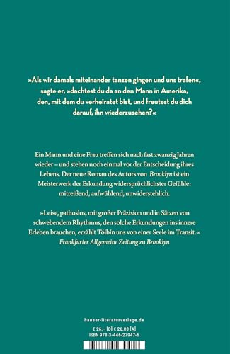Ein Mann und eine Frau treffen sich nach fast zwanzig Jahren wieder – und stehen noch einmal vor der Entscheidung ihres Lebens. Eilis lebt in Long Island mit ihren Kindern und Tony, für den sie ihre Jugendliebe Jim in Irland zurückliess. Als sie erfährt, dass Tony sein uneheliches Kind in der gemeinsamen Familie aufziehen will, bricht sie in ihre Heimat auf. Dort holen sie ihre alten Gefühle ein. Mit atemberaubender Intensität und psychologischer Klarsicht erzählt Tóibín von dem Versteckspiel, das sich zwischen den ehemaligen Liebenden entspinnt. Der neue Roman des Autors von „Brooklyn“ ist ein Meisterwerk der Erkundung widersprüchlichster Gefühle: mitreissend, aufwühlend, unwiderstehlich.