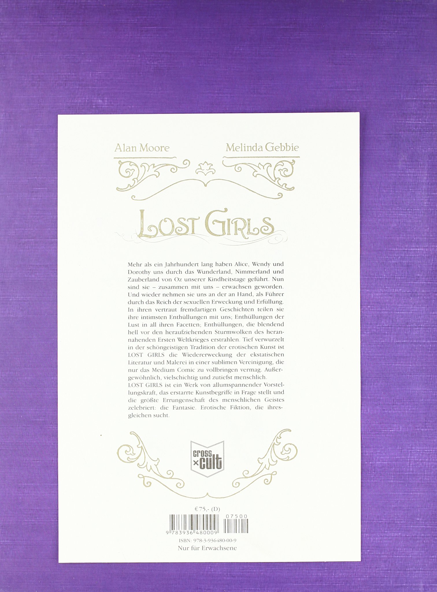 Lost Girls ist eine anspruchsvolle, fantasievolle, erotische Graphic Novel, die die sexuellen Abenteuer von drei der bekanntesten weiblichen Figuren des späten 19. und frühen 20. Jahrhunderts beschreibt: Alice aus Alice im Wunderland, Dorothy Gale aus dem Zauberer von Oz und Wendy Darling aus Peter Pan. Sie treffen sich als Erwachsene 1913 in einem österreichischen Hotel und erzählen sich ihre erotischen Abenteuer und Träume. Historische Ereignisse wie das Attentat auf Erzherzog Franz Ferdinand werden ebenso in die Erzählung eingewoben wie pornografische Literatur und Kunst dieser Zeit. Jedes Kapitel wird in dem Stil eines anderen Künstlers der Epoche präsentiert, darunter Oscar Wilde, Aubrey Beardsley, Alfons Mucha und Egon Schiele.