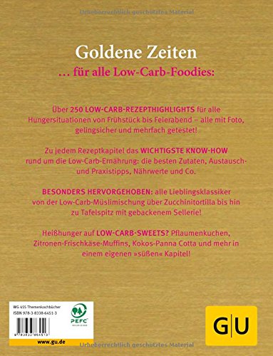 Glänzende Zeiten für Low-Carb-Foodies: Die besten Rezepte und alles Wissenswerte rund um den modernen, gesunden Lifestyle gibt's jetzt glamourös verpackt zwischen zwei Buchdeckeln. Low Carb! Das Goldene von GU ist die Bibel dieses Trends: Neben 250 Rezepten wird in den einleitenden Kapiteln alles Wichtige zur Low-Carb-Ernährung erklärt, von den besten Zutaten, Nährwerten, Austauschmöglichkeiten für Zucker und Mehl, bis hin zu praktischen Tipps zur richtigen Zubereitung und alltagstauglichen Umsetzung des angesagten Ernährungsstils. Die Rezepte sind Highlights der GU Low-Carb-Kompetenz: vom Frühstück über Salate, Suppen und Snacks to go, bis zur Veggieküche, leckeren Feierabendgerichten und trendigem Asia-Food wird hier nichts ausgelassen. Wer Heißhunger auf Low-Carb-Sweets hat, liegt mit den Rezepten für kohlenhydratreduzierte Kuchen, Cremes und Smoothies ebenfalls goldrichtig. Hochwertig gestaltet, superlecker und immer nahe am Alltag - mehr Low Carb geht nicht!