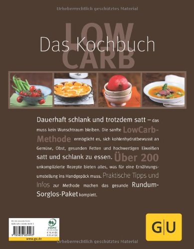 Jetzt wieder im Programm: Der Klassiker unter den LowCarb - Kochbüchern! Das Ernährungsprinzip Low Carb hat sich einen festen Platz unter den Diätmethoden erobert. Immer mehr Menschen wissen die sanfte Methode zu schätzen, sich kohlenhydratbewusst an Gemüse, Obst, gesunden Fetten und hochwertigen Eiweissen satt und dauerhaft schlank zu essen. Das GU-Standardwerk der LowCarb-Küche - mit über 200 kohlenhydratreduzierten, vitalstoffreichen und unkomplizierten Rezepten für jeden Tag. Dazu alles, was man über diese Ernährungsmethode wissen muss, und alles, was den Alltag leichter macht - das gesunde und genussreiche Rundum-Sorglos-Paket also!