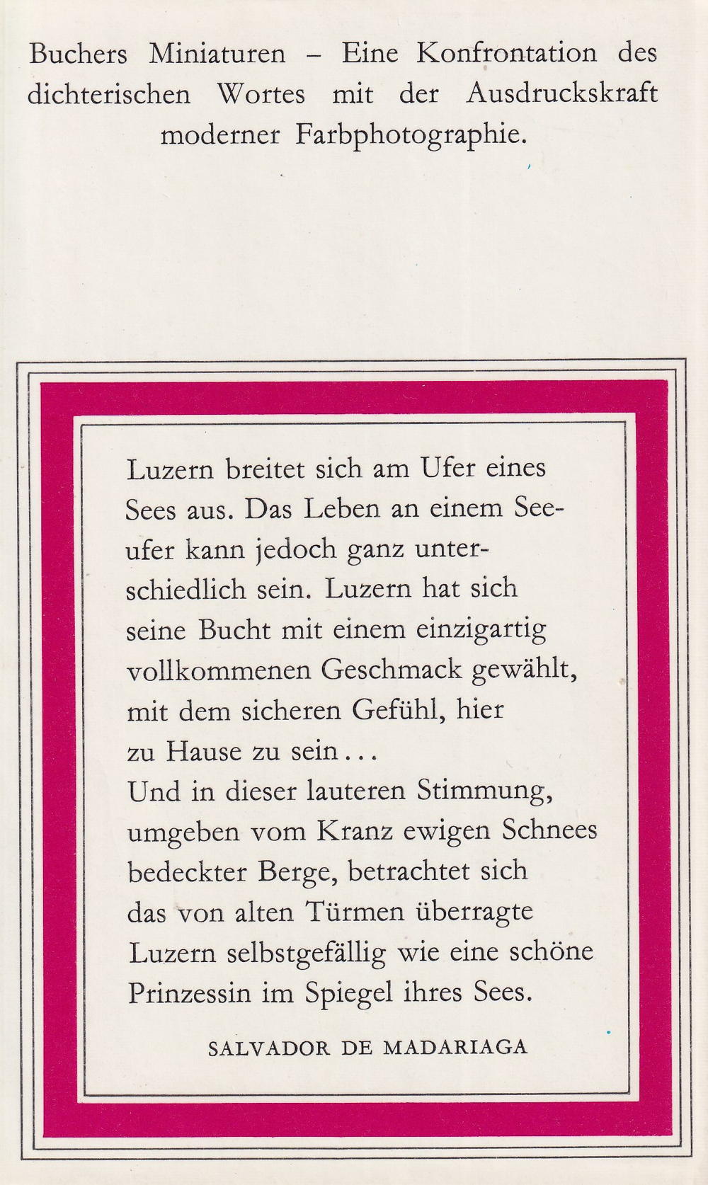 Und in dieser lauteren Stimmung, umgeben vom Kranz ewigen Schnees bedeckter Berge, betrachtet sich das von alten Türmen überragte Luzern selbstgefällig wie eine schöne Prinzessin im Spiegel ihres Sees.
