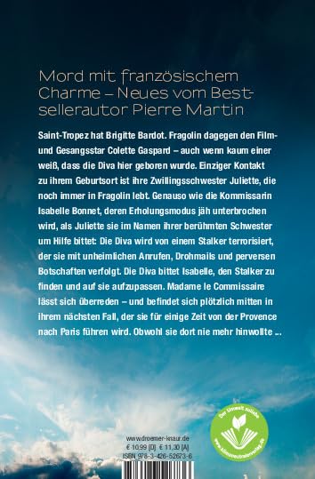 Saint-Tropez hat Brigitte Bardot. Fragolin dagegen den Film- und Gesangsstar Colette Gaspard - auch wenn kaum einer weiss, dass die Diva hier geboren wurde. Schliesslich hat sie das provenzalische Dorf schon in jungen Jahren verlassen. Einziger Kontakt zu ihrem Geburtsort ist ihre Zwillingsschwester Juliette, die noch immer in Fragolin lebt. Genauso wie die Kommissarin Isabelle Bonnet. Diese befindet sich wieder einmal im Erholungsmodus. Der wird jäh unterbrochen, als Juliette sie im Namen ihrer berühmten Schwester um Hilfe bittet: Die Diva wird von einem Stalker terrorisiert, der sie mit unheimlichen Anrufen, Drohmails und perversen Botschaften verfolgt. Colette Gaspard wohnt in Ramatuelle. Das ist nicht weit weg. Die Diva bittet Isabelle, den Stalker zu finden und auf sie aufzupassen, schliesslich sei sie mal Personenschützerin gewesen. Madame le Commissaire lässt sich überreden – und befindet sich plötzlich mitten in ihrem nächsten Fall, der sie für einige Kapitel von der Provence nach Paris führen wird. Obwohl sie dort nie mehr hinwollte …