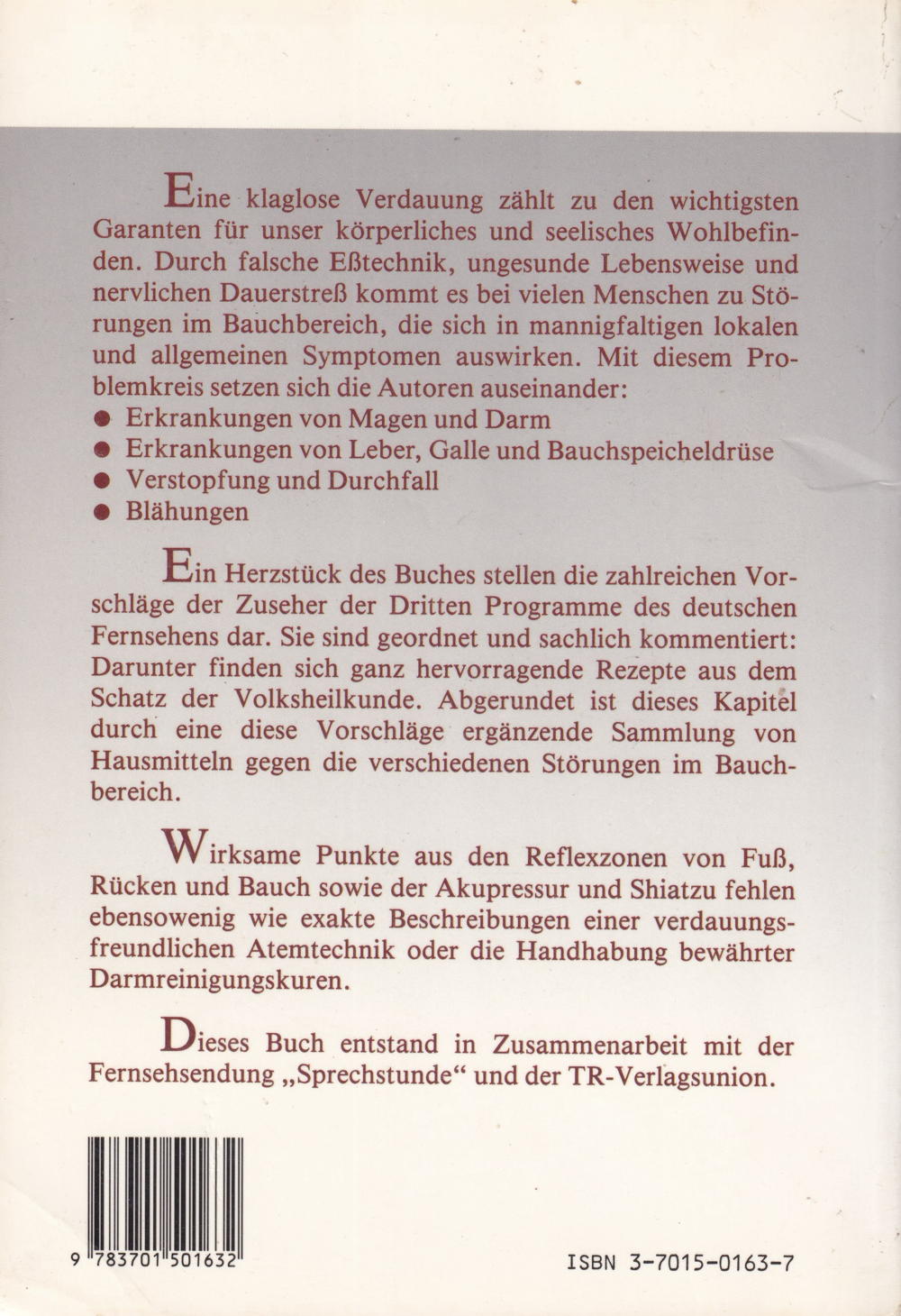 Ein Herzstück des Buches stellen die zahlreichen Vorschläge der Zuseher der Dritten Programme des deutschen Fernsehens dar. Sie sind geordnet und sachlich kommentiert: Darunter finden sich ganz hervorragende Rezepte aus dem Schatz der Volksheilkunde. Abgerundet ist dieses Kapitel durch eine diese Vorschläge ergänzende Sammlung von Hausmitteln gegen die verschiedenen Störungen im Bauchbereich.