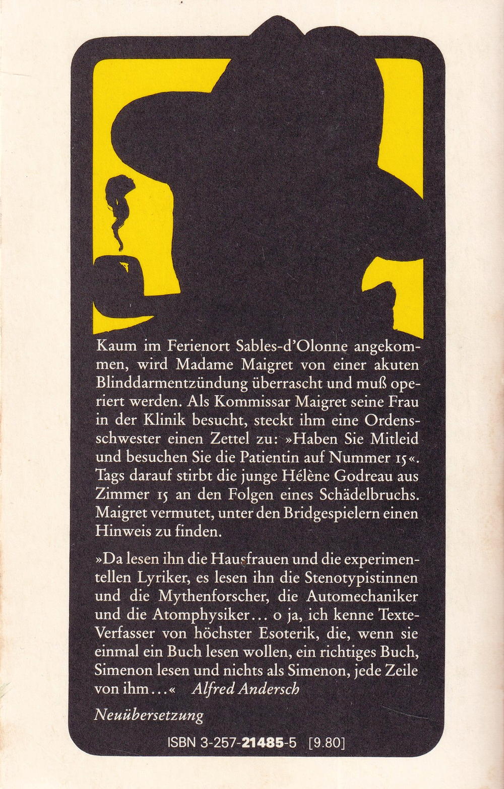 Kaum im Ferienort Sables-d' Olonne angekommen, wird Madame Maigret von einer akuten Blinddarmentzündung überrascht und muss operiert werden. Als Kommissar Maigret seine Frau in der Klinik besucht. Steckt ihm eine Ordens Schwester einen Zettel zu:>Haben Sie Mitleid und besuchen Sie die Patientin auf Nummer I5< .Tags darauf stirbt die junge Helene Godreau aus Zimmer I5 an den Folgen eines Schädelbruchs. Maigret vermutet, unter den Bridgespielern einen Hinweis zu finden