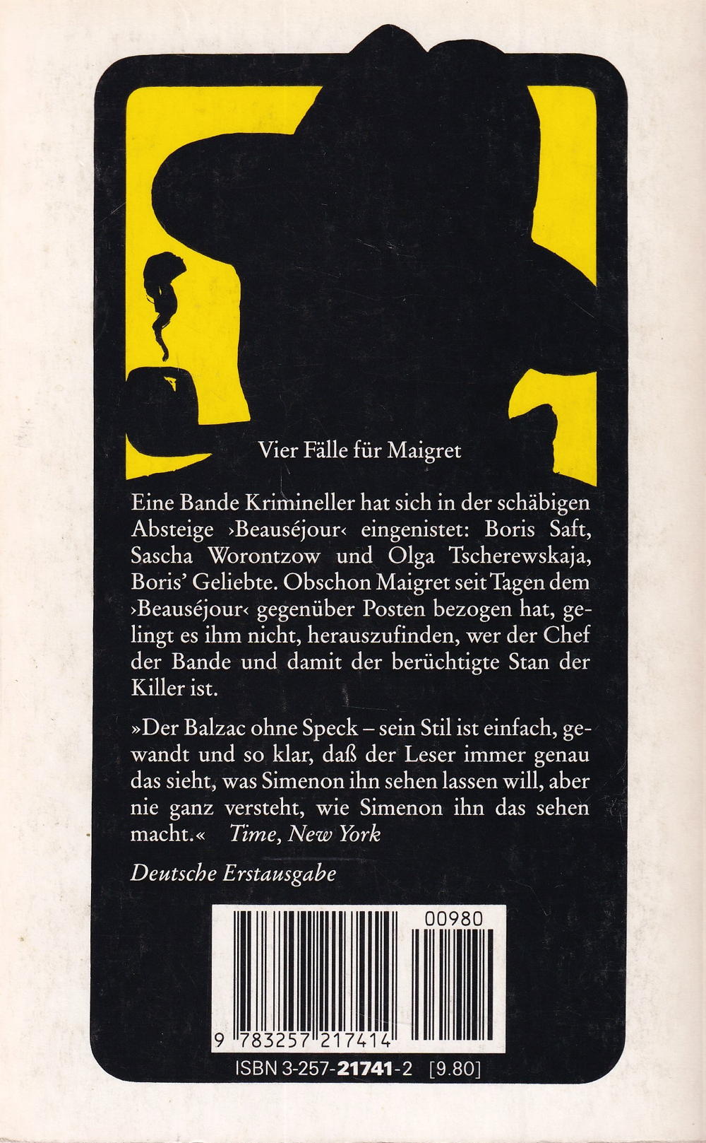 Georges Simenon, geb. am 13. Februar 1903 in Liège/Belgien, begann nach abgebrochener Buchhändlerlehre als Lokalreporter. Nach einer Zeit in Paris als Privatsekretär eines Marquis wohnte er auf seinem Boot, mit dem er bis nach Lappland fuhr, Reiseberichte und erste Maigret-Romane verfassend. Schaffenswut und viele Ortswechsel bestimmten 30 Jahre lang sein Leben, bis er sich am Genfersee niederliess, wo er nach 75 Maigret-Romanen und über 120 Non-Maigrets beschloss, statt Romane ausgreifende autobiographische Arbeiten (wie die monumentalen Intimen Memoiren ) zu diktieren. Er starb am 4. September 1989 in Lausanne.