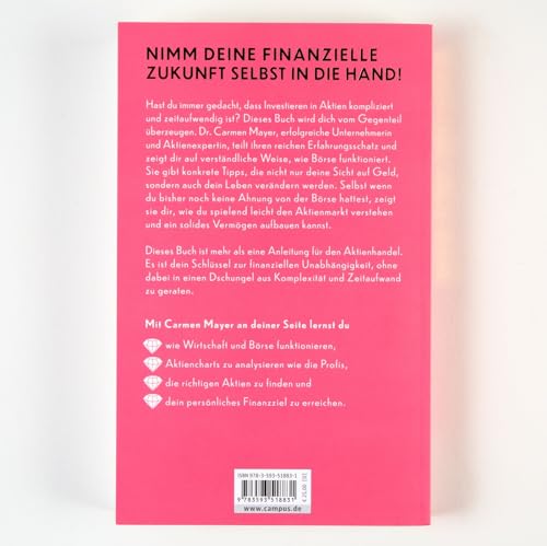 Wer möchte nicht finanziell frei sein? An der Börse reich zu werden und sich den Traum von finanzieller Freiheit zu erfüllen, scheint fast unerreichbar. Was im ersten Moment utopisch klingt, ist aber nicht so abwegig: schliesslich zählen Aktien heute trotz aller Risiken nachweislich zu den erfolgreichsten Anlageformen. Mit ihrem Buch möchte Carmen Mayer vor allem Frauen ermutigen und sie mit konkreten Tipps unterstützen, sich mit den eigenen Geldangelegenheiten auseinanderzusetzen und sich ein Vermögen aufzubauen. Sie ist davon überzeugt, dass mit etwas Zeit und Mühe jeder Mensch finanziell unabhängig werden kann. Ihr eigener Werdegang zeigt, dass sich prinzipiell jeder den Wunsch von finanzieller Freiheit erfüllen kann - wenn man es sich nicht nur wünscht, sondern auch handelt.