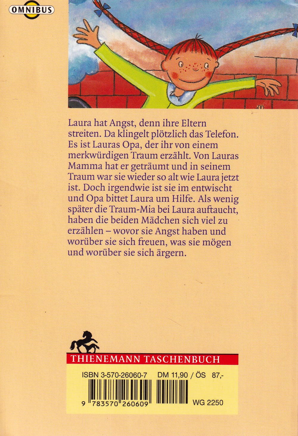 Laura hat Angst, denn ihre Eltern streiten. Da klingelt plötzlich das Telefon. Es ist Lauras Opa, der ihr von einem merkwürdigen Traum erzählt. Von Lauras Mamma hat er geträumt und in seinem Traum war sie wieder so alt wie Laura jetzt ist. Doch irgendwie ist sie im entwischt und Opa bittet Laura um Hilfe. Als wenig später die Traum-Mia bei Laura auftaucht, haben die beiden Mädchen sich viel zu erzählen - wovor sie Angst haben und worüber sie sich freuen, was sie mögen und worüber sie sich ärgern.